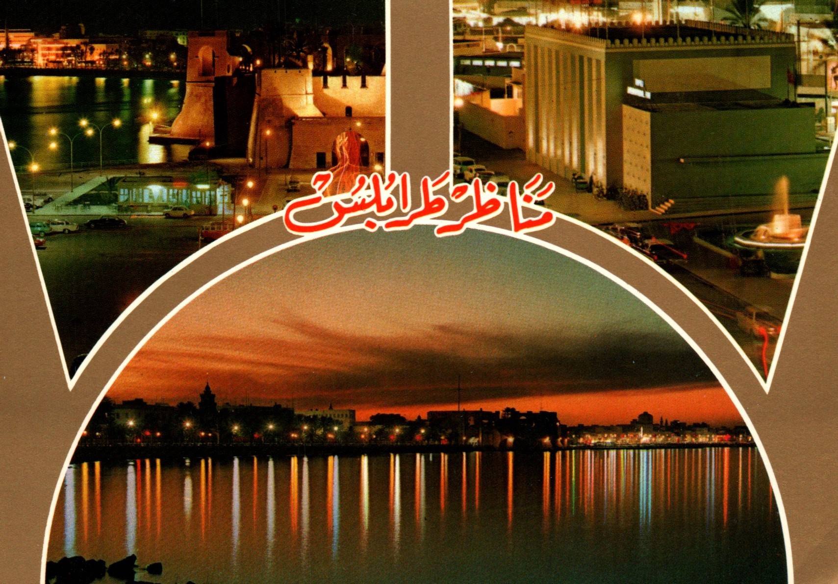 Эффективная открытка из Триполи, столицы Ливии, показывает город после наступления темноты - в свете фонаря, неоновые огни и отражения, отражающие в спокойной порту. Фото шоу, среди прочего, крепость Ас-Сарайя Аль-Хамра (Красная замок), современная архитектура и набережная приморья. Это ночная панорама города с того времени, когда Триполис был важным центром политической и экономической жизни Ливии.