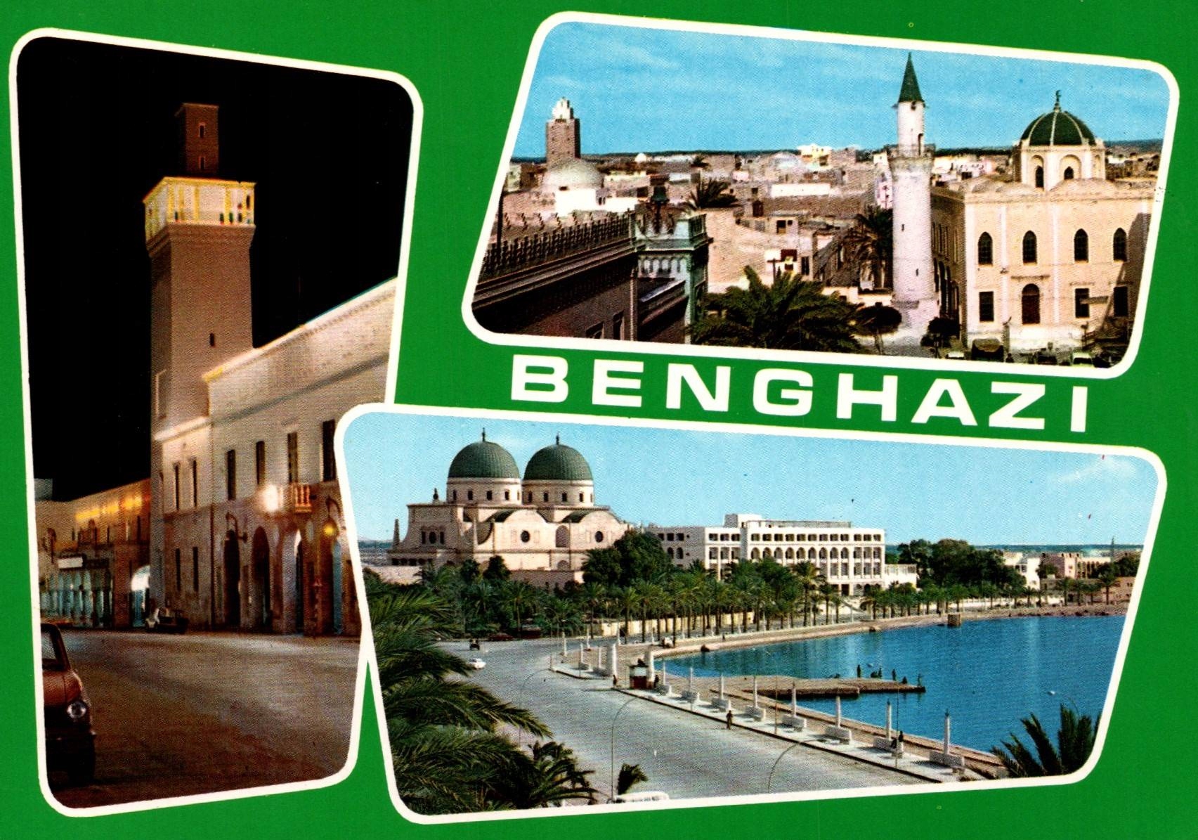Темы для коллекционеров: Ливия, Бенгази, мусульманская архитектура, мечети, прибрежные города, ночные и дневные виды, колониальные здания, цветная открытка, 1960-70-е годы, Северная Африка.
