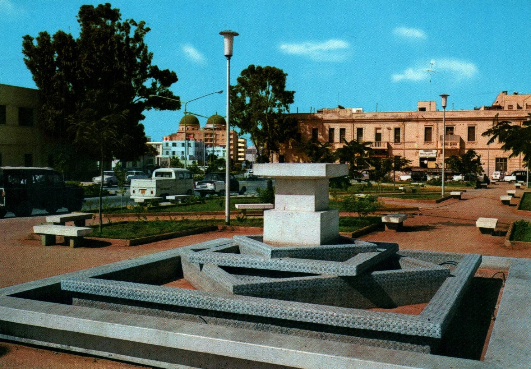 Bengazi, Place miejskie, Площадь Гаити, польская диаспора, Ливия с латахом 70., архитектурная архитектура, фонтан, krajobraz miejski, PRL-owskie pocztówki zagraniczne, Polacy w Afryce, Polskie Radio, почтовые речевые письма, коллекция корреспондентских карт из Ливии.