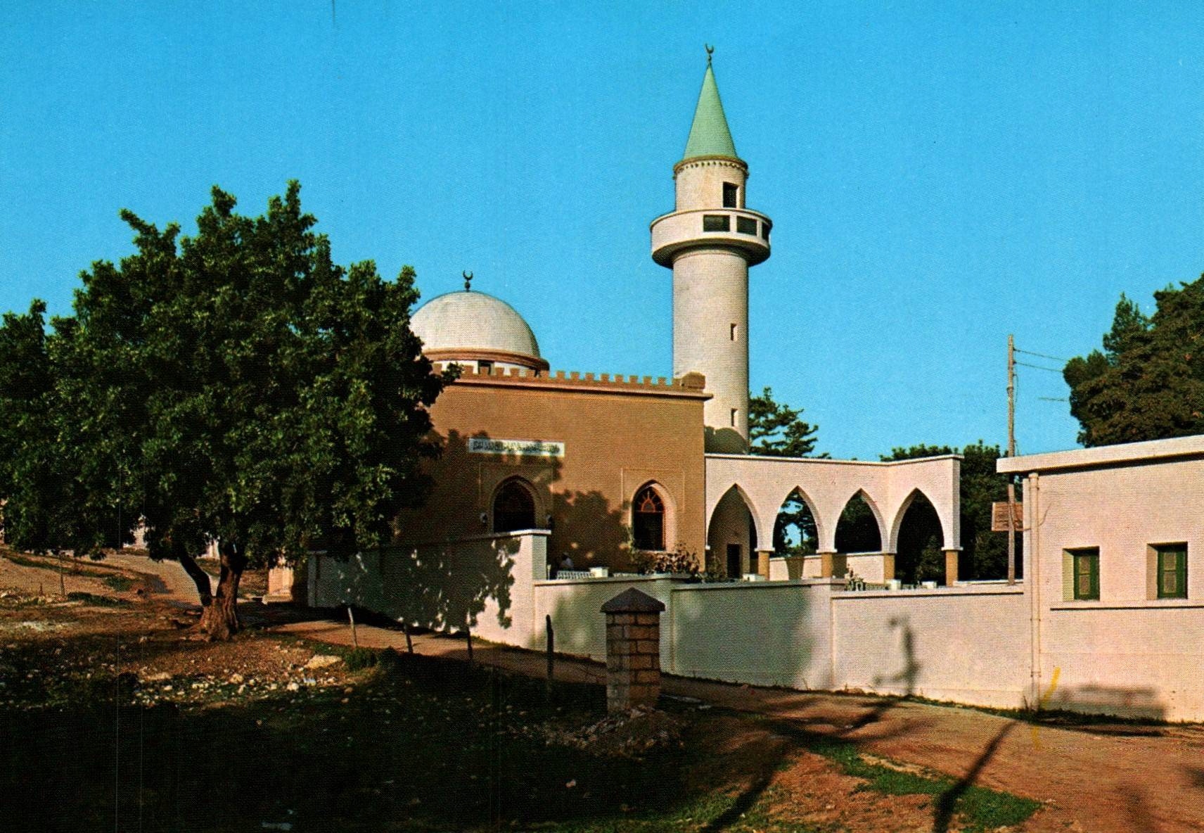 На представленной открытке изображено очаровательное памятное место в Эль-Бейде - городе, расположенном на востоке Ливии, известном своими зелеными холмами и религиозным значением. На фото мавзолей Руфа Аль-Ансари – одно из важнейших исламских святынь в регионе Киренаика. Здание с куполом и стройным минаретом, окруженное белой стеной и зеленью, отличается типичной арабской архитектурой с арочными порталами и спокойной обстановкой. Это место привлекает паломников и туристов, интересующихся историей и религией региона.