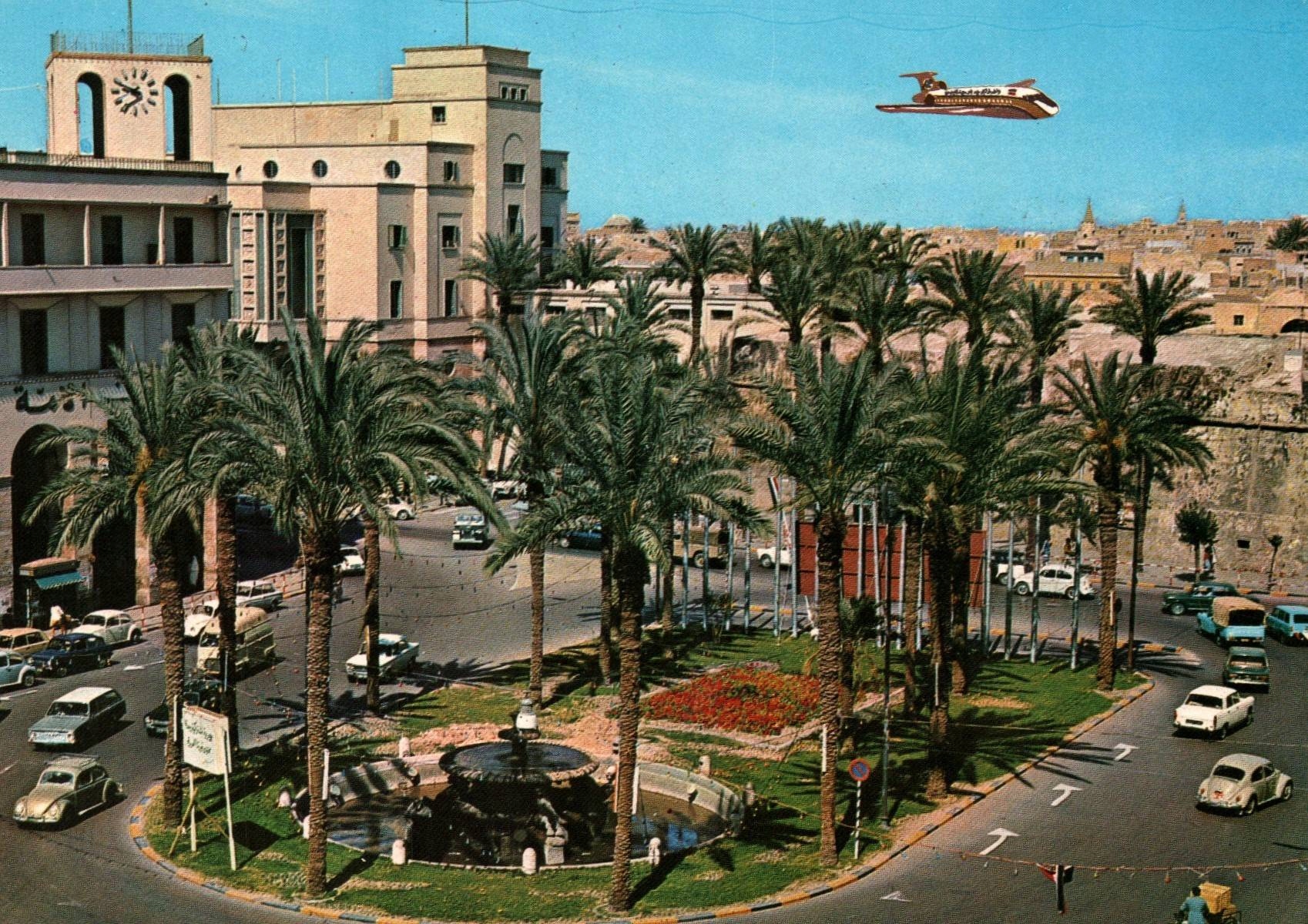 На снимке видна одна из самых узнаваемых точек Триполи – Площадь Мучеников, ранее известная как Пьяцца Италия. Это монументальное место является центром города, где пересекаются пути колониальной истории, независимости и современной истории. На фотографии преобладает зелень пальм и впечатляющий фонтан в центре кольцевой развязки, окруженный старинными автомобилями и характерными итальянскими зданиями на заднем плане – пережитком периода итальянского правления в Ливии. С левой стороны выделяется монументальное здание с башенными часами. На заднем плане видна часть старой медины (Касба), что делает эту открытку уникальным свидетельством городской структуры Триполи до модернизации.