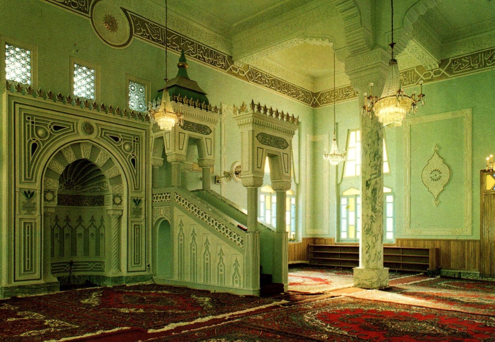 На открытке представлен интерьер мечети Идрис в Триполи, одного из самых характерных молитвенных мест в столице Ливии. Интерьер восхищает нежными, пастельно-зелеными тонами, декоративными украшениями михраба и минбара, а также мраморными колоннами и впечатляющими люстрами. Все это дополняется коврами ручной работы и арабской каллиграфией, идущими вдоль верхних частей стен. Фотография отражает мирную, духовную атмосферу этого священного места, которое является свидетельством исламской архитектуры и декоративного искусства.