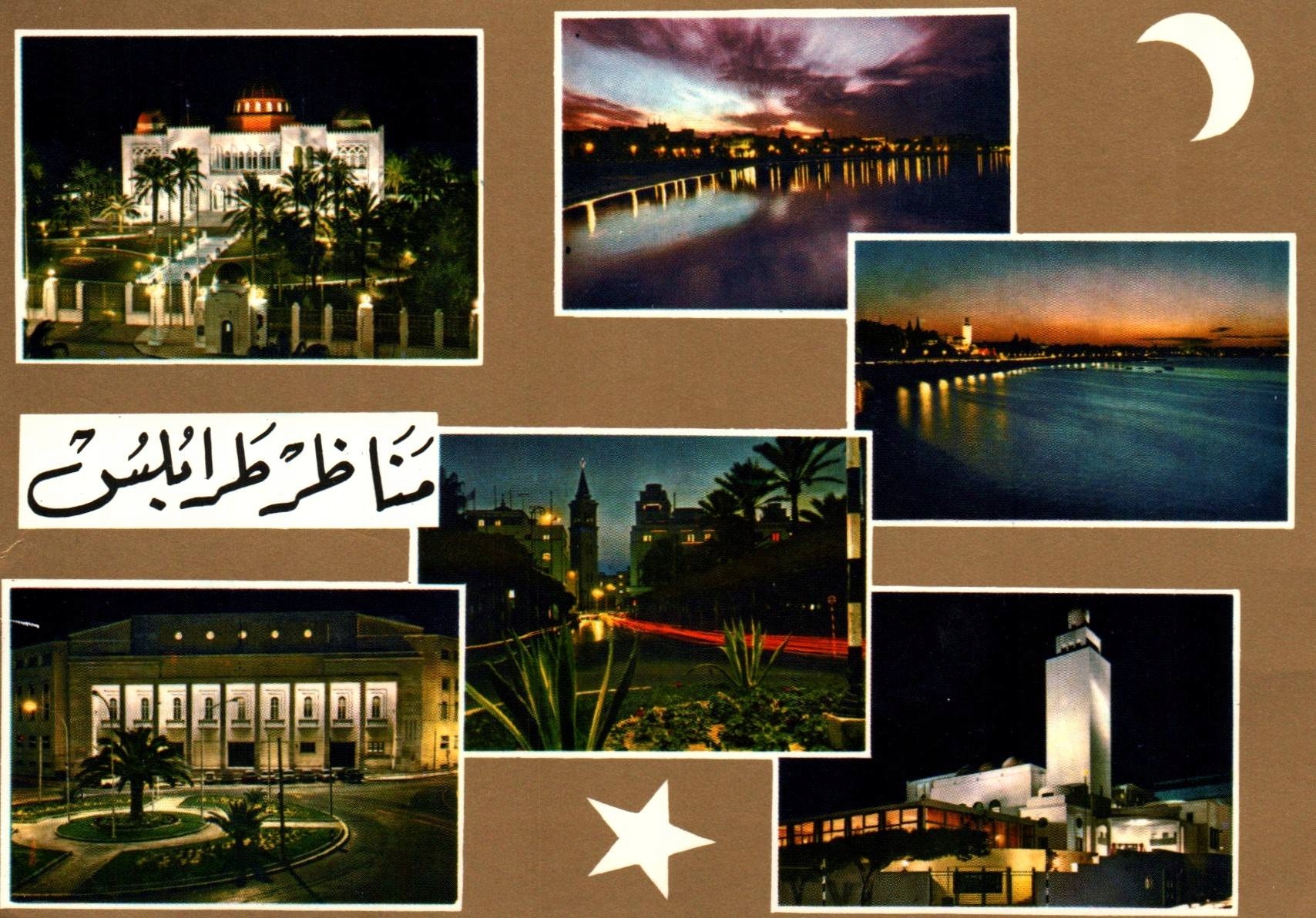 Красочная открытка-коллаж с изображением ночных видов Триполи - столицы Ливии. Шесть фотографий были размещены на темном фоне: