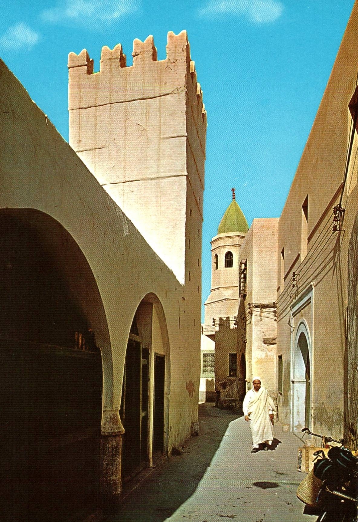 Уникальная атмосферная открытка с изображением узкой улочки Старого города в Триполи, столице Ливии. На снимке изображена типичная арабская архитектура с белыми стенами, арками и высокой башней с зубцами и зеленым куполом на заднем плане. Все это создает чрезвычайно живописный и достоверный образ повседневной жизни старой части города, обогащенный фигурой мужчины в традиционной одежде, идущего по тенистой улице.