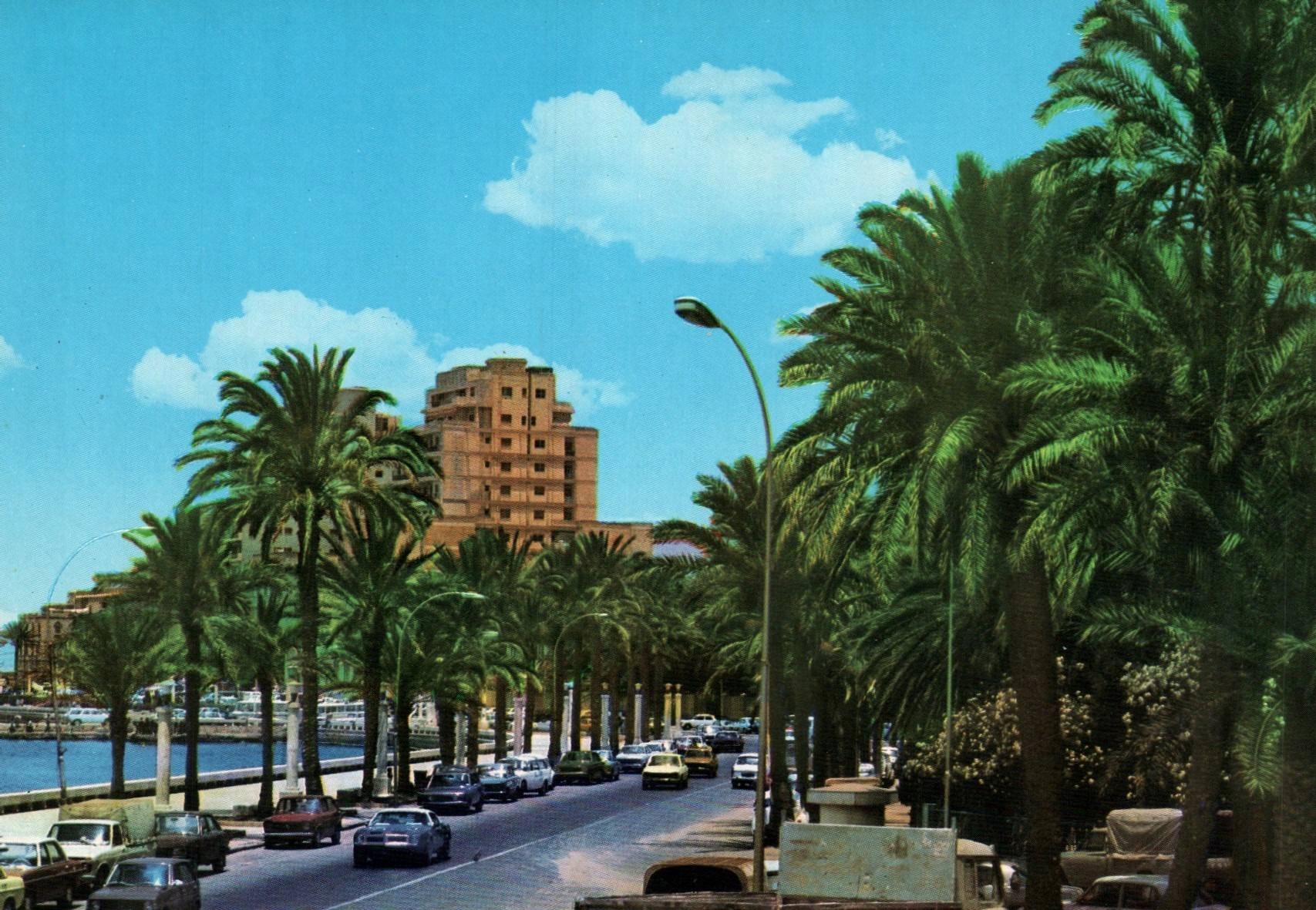 На открытке изображен живописный фрагмент улицы Энассер в ливийском Бенгази - широкой приморской артерии, окруженной впечатляющими рядами финиковых пальм. С левой стороны вид на море, а на заднем плане многоэтажные жилые дома в типичном стиле 1970-х годов. Уличное движение классических автомобилей отражает атмосферу повседневной жизни одного из важнейших мегаполисов Северной Африки того времени. Снимок прекрасно отражает колониально-современный характер города, который в то время был центром культуры, торговли и образования.