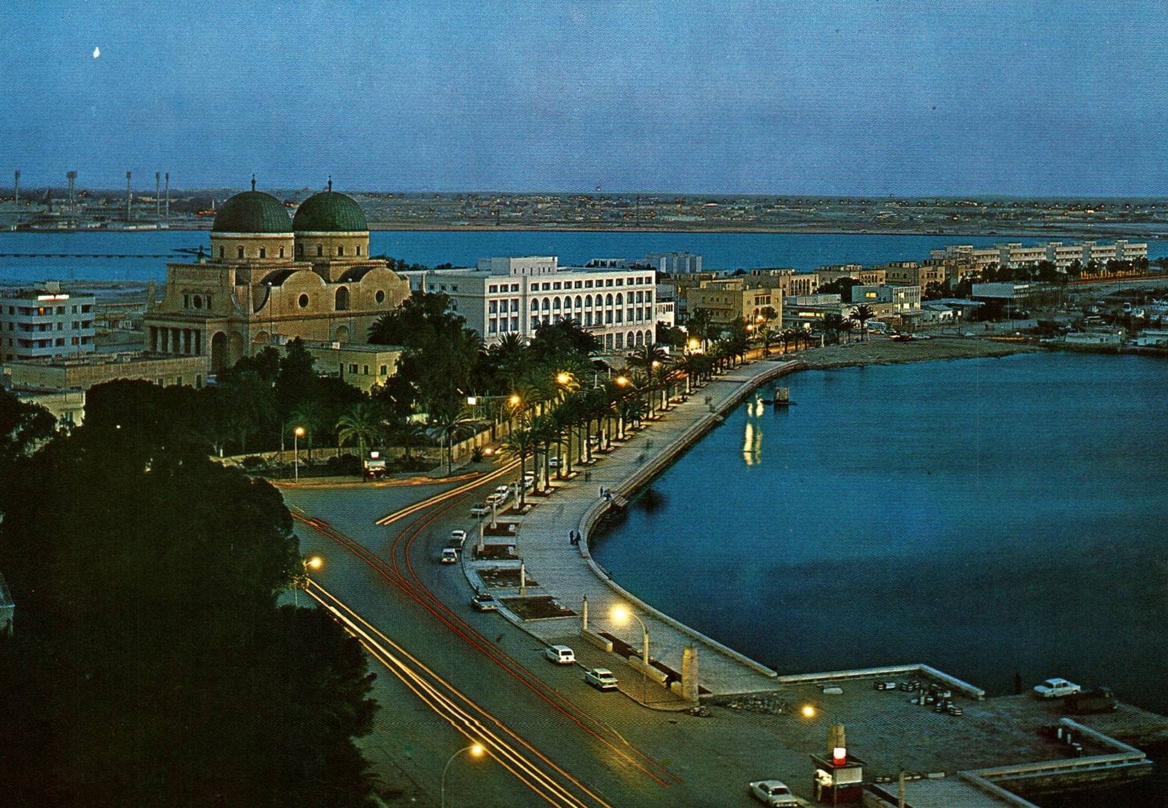 На открытке изображен живописный фрагмент морской набережной Корниш в Бенгази - одной из главных артерий города, проходящей вдоль береговой линии. Ночная панорама показывает элегантные здания с колониальными фасадами, величественную мечеть с двумя куполами, ряды пальм, освещенные городскими фонарями, и поворот улицы с динамичными полосами автомобильных фонарей. На заднем плане порт и лагуна, а дальше видны освещенные жилые кварталы города.