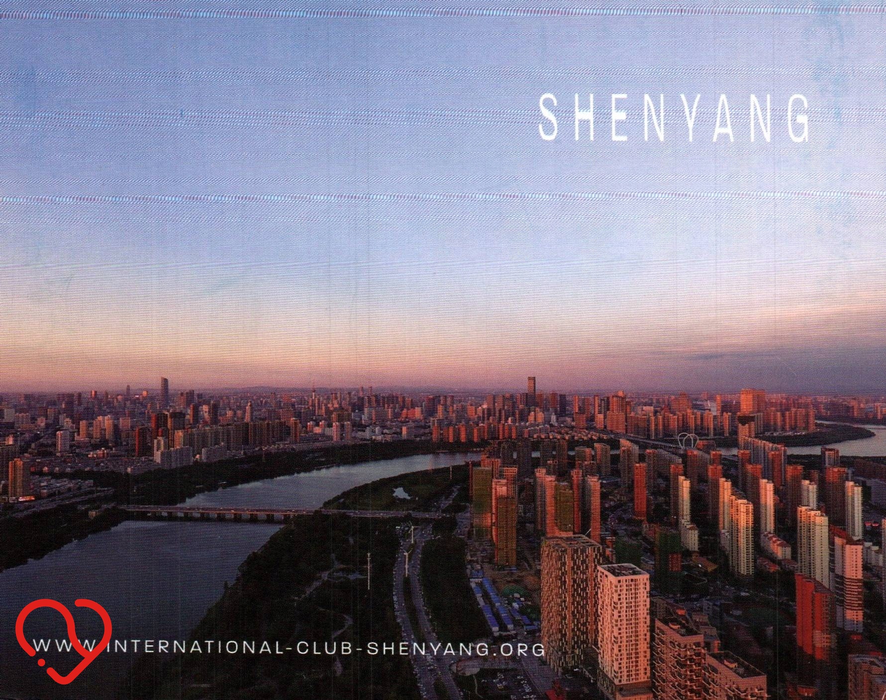 На аверсе изображена современная панорама города Шэньян в Китае, снятая в сумерках. На снимке видна плотная городская застройка с многочисленными небоскребами, тянущаяся вдоль излучины реки Хун. Небо окрашивается в оттенки фиолетового и розового, а в правом верхнем углу появляется надпись «ШЭНЯН» белого цвета. Внизу указан адрес сайта международного клуба. Обратная сторона открытки пустая, не бывшая в обращении. Вверху надпись: «©Фото сделано Медоном Декером, Германия». В левом нижнем углу расположен логотип с изображением пагоды и адрес сайта https://www.google.com/search?q=landingeast.com.