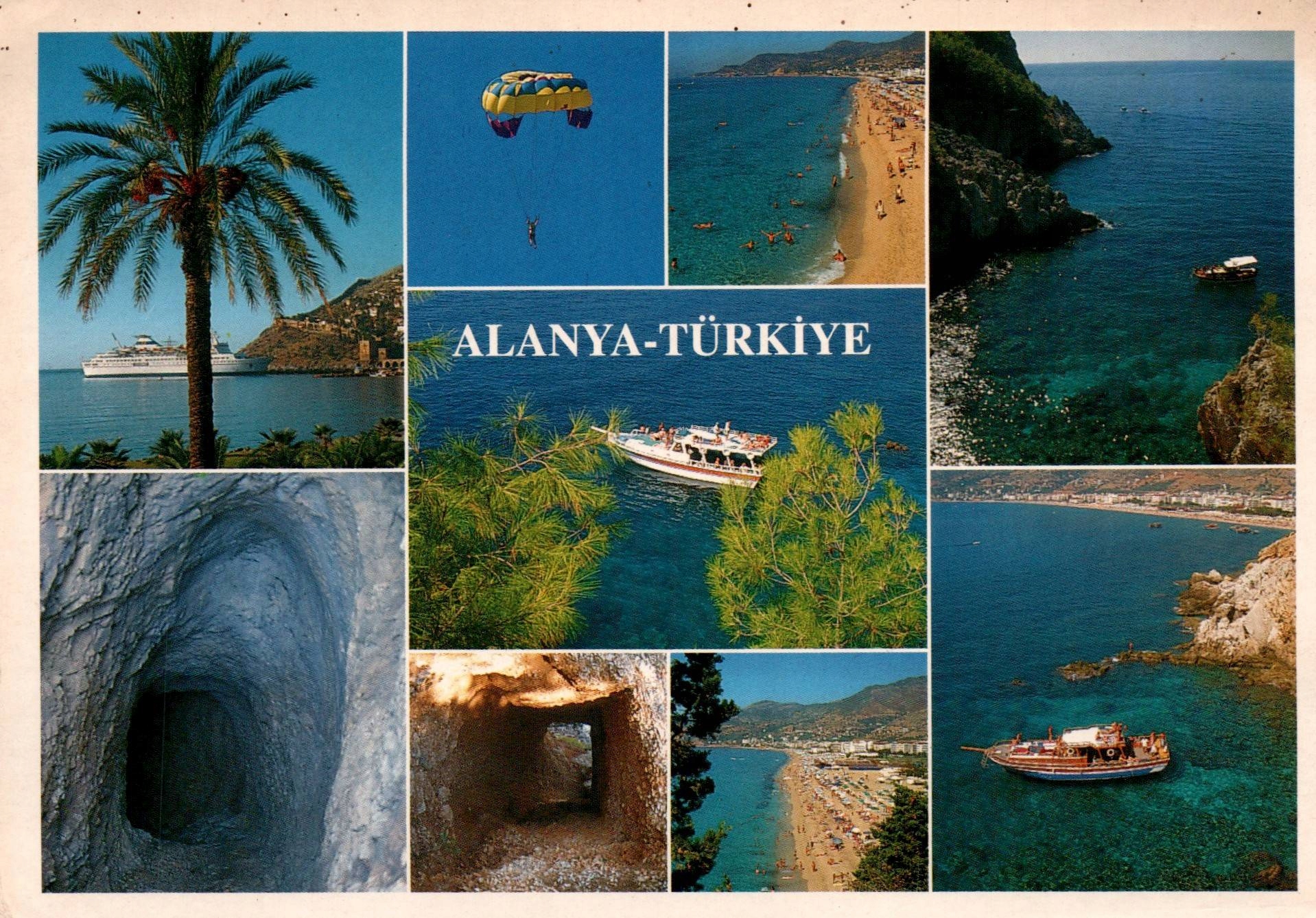 На открытке показано очарование солнечной Алании (Турция), одного из красивейших курортов Турецкой Ривьеры, полного контрастов. На коллаже изображены: вид на Аланьский залив с пальмой и пассажирским судном, широкий песчаный пляж, полный туристов, впечатляющие скалы и кристально чистые воды Средиземного моря, а также туннели и скальные пещеры – свидетельства богатой истории региона. Видимый в центре парусник напоминает нам о местных круизах вдоль побережья и отдыхе в окружении природы. На открытке изображена праздничная атмосфера города, изобилующего жизнью, водными видами спорта и средиземноморским климатом.