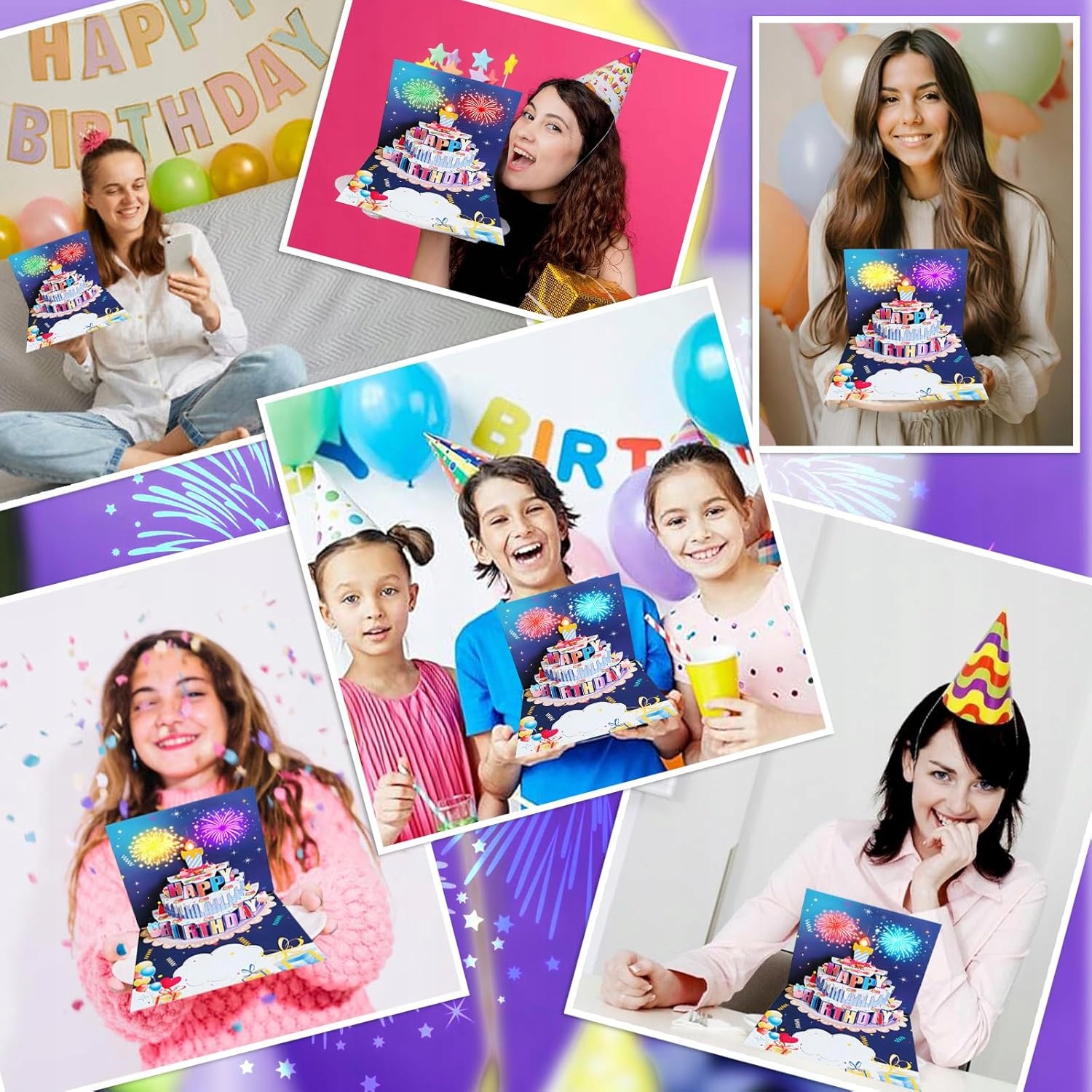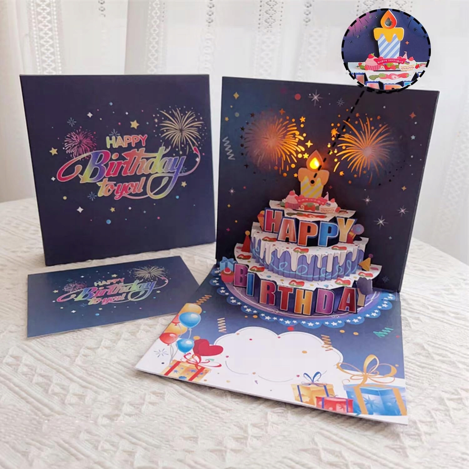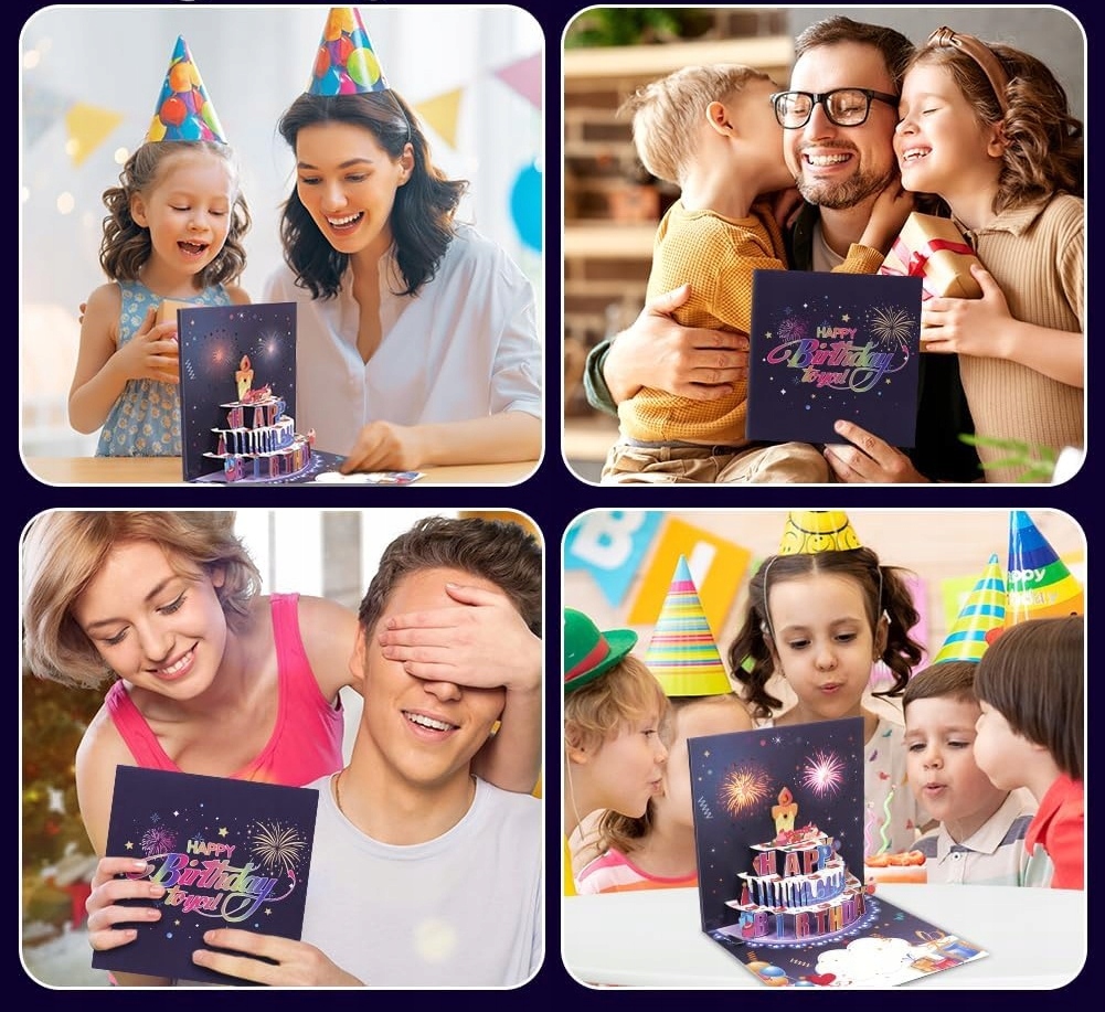 Когда вы открываете поздравительную открытку для женщин, из центра появляется всплывающий торт под музыку. После того, как вы дважды проиграете песню «С Днем Рождения», задуйте свечи, и красочный фейерверк загорится синхронно со звуком фейерверка, добавив к вашим пожеланиям на день рождения нотку роскоши и волшебства.