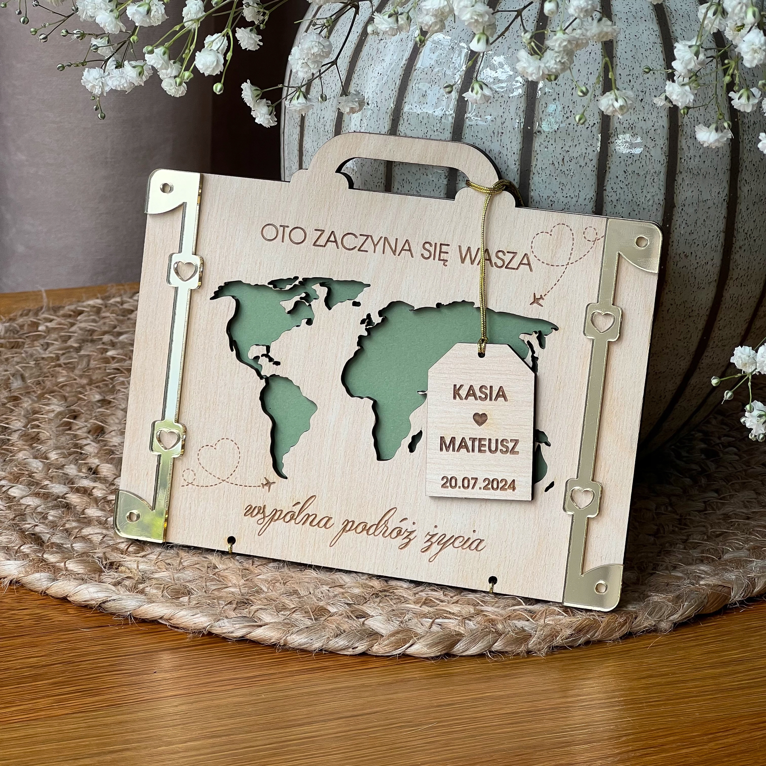 На лицевой стороне карты изображена вырезанная карта мира (цвет карты соответствует цвету выбранного конверта) и украшены золотыми элементами. К шее прикреплен конверт (8 цветов на выбор). Открытка перевязана деревянной запиской с именами жениха и невесты и датой свадьбы. >
