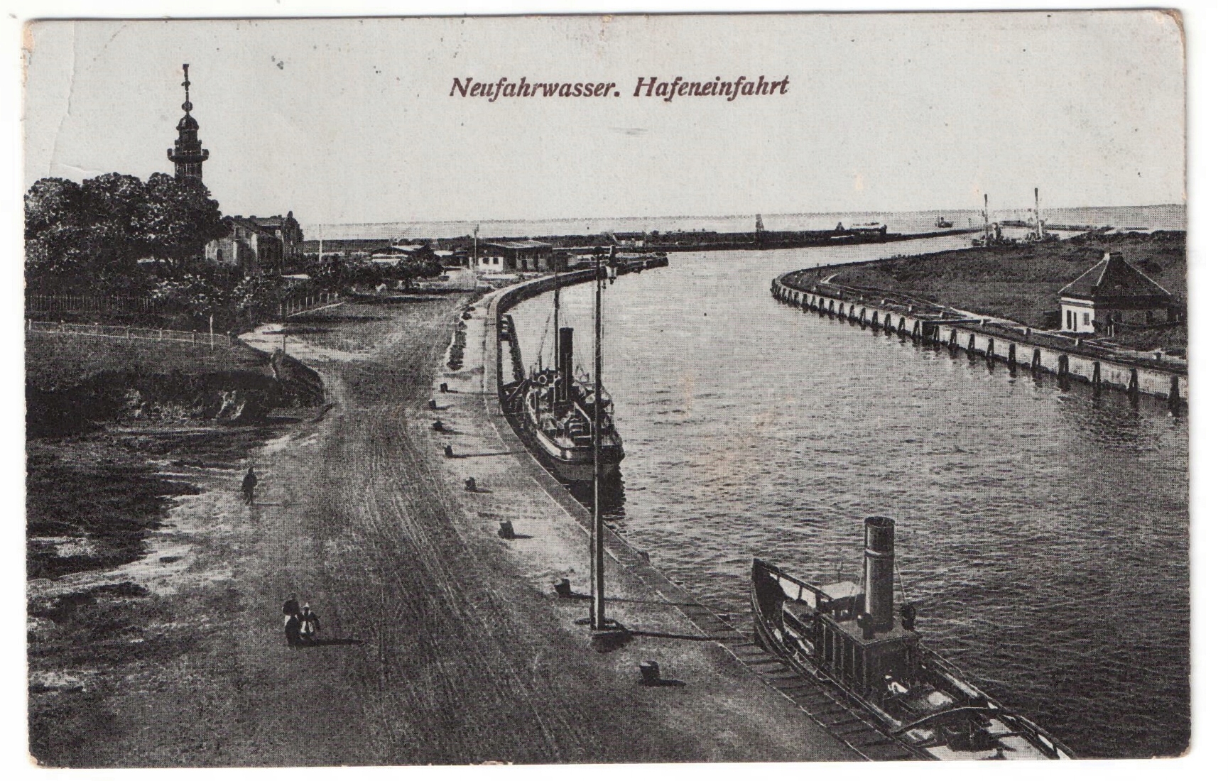 Как следует из названия. Карточка 1903 года, вид на Гданьский порт в районе Нового Порта. Открытка издана на местном уровне - Гданьск: Bracia Freymann G.m.b.h. Открытка была отправлена местному получателю: г-же Самульской из Оливы.