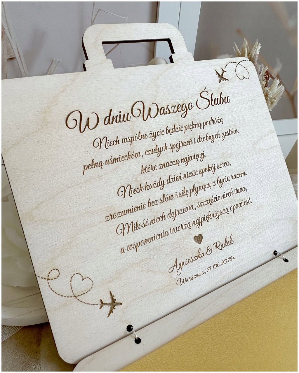 Чифт изготовлен из деревянной, Березовой фанеры . Снаружи есть карта мира, которая является символом начала распространенного семейного путешествия. Существуют уникальные, персонализированные пожелания и конверт за деньги в красивом, металлизованном цвете (выбрать 2 цвета )