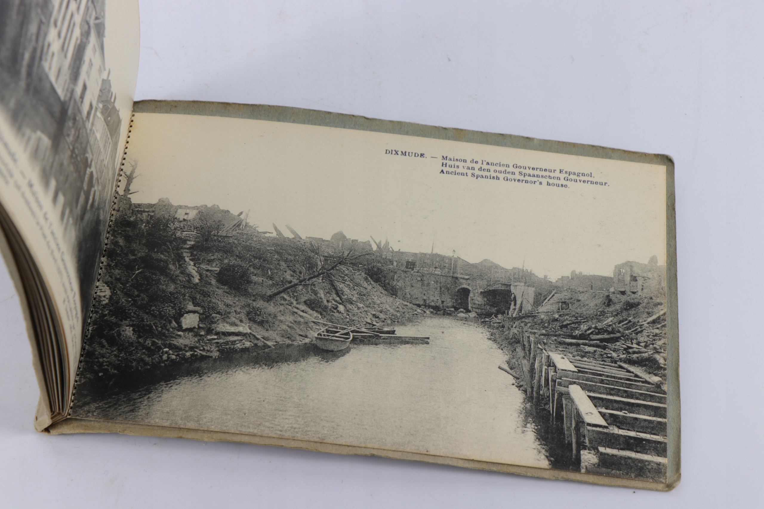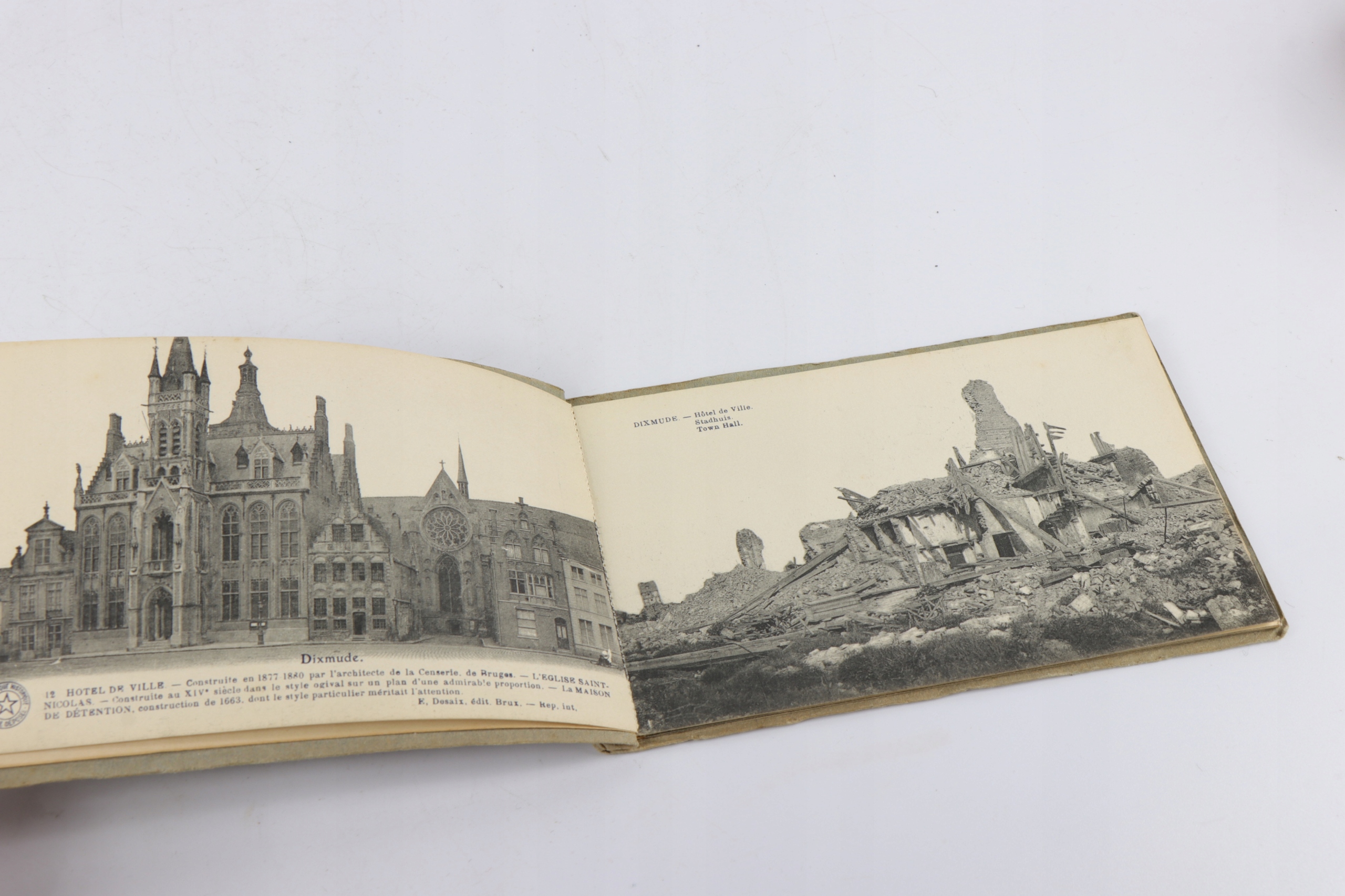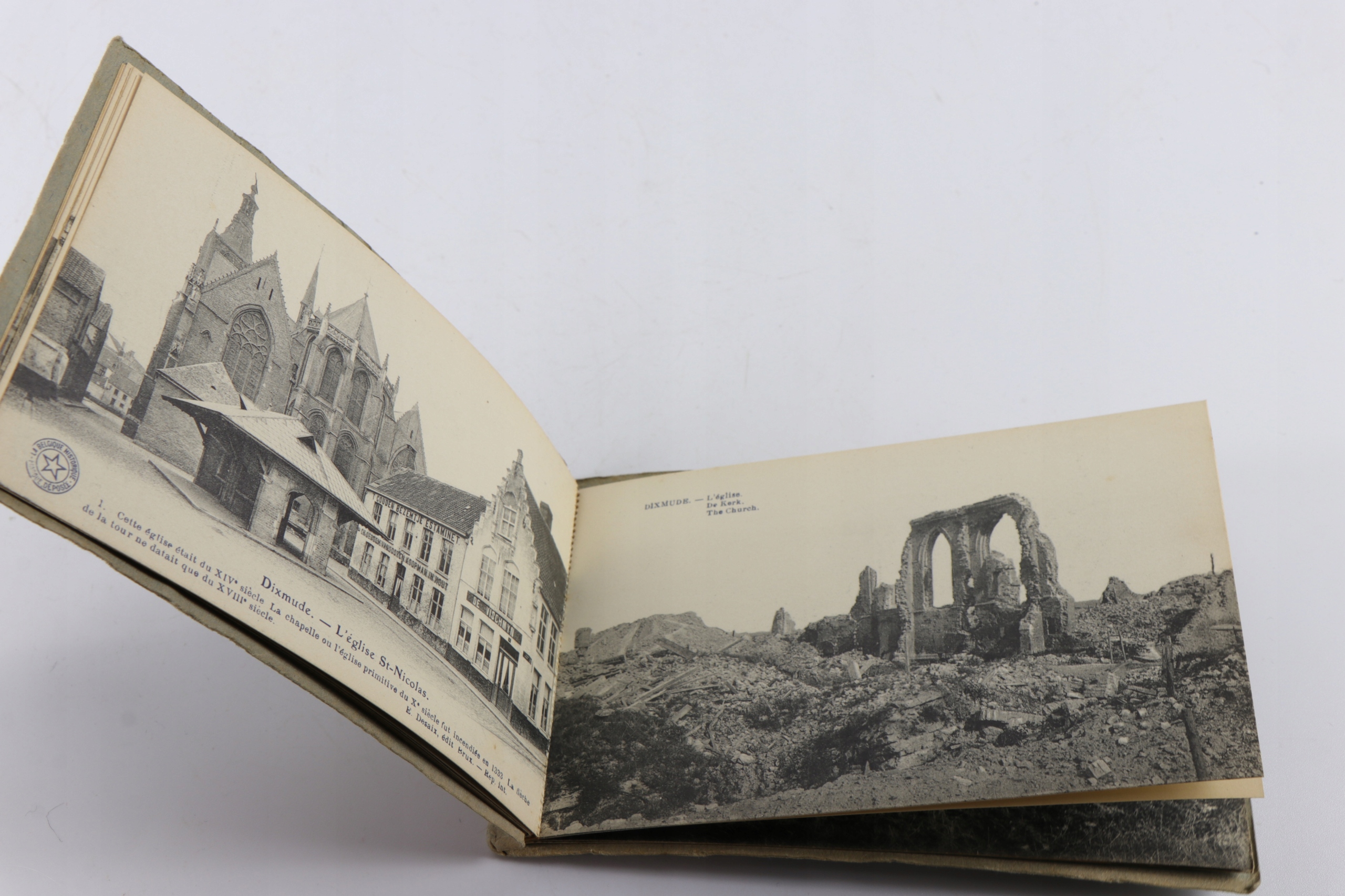 Интересная оригинальная книга с десятью открытками, показывающими разрушения в Диксмуде во время Первой мировой войны. На открытках показано сравнение объекта до Первой мировой войны с одной стороны и объекта, разрушенного после Первой мировой войны, с другой.