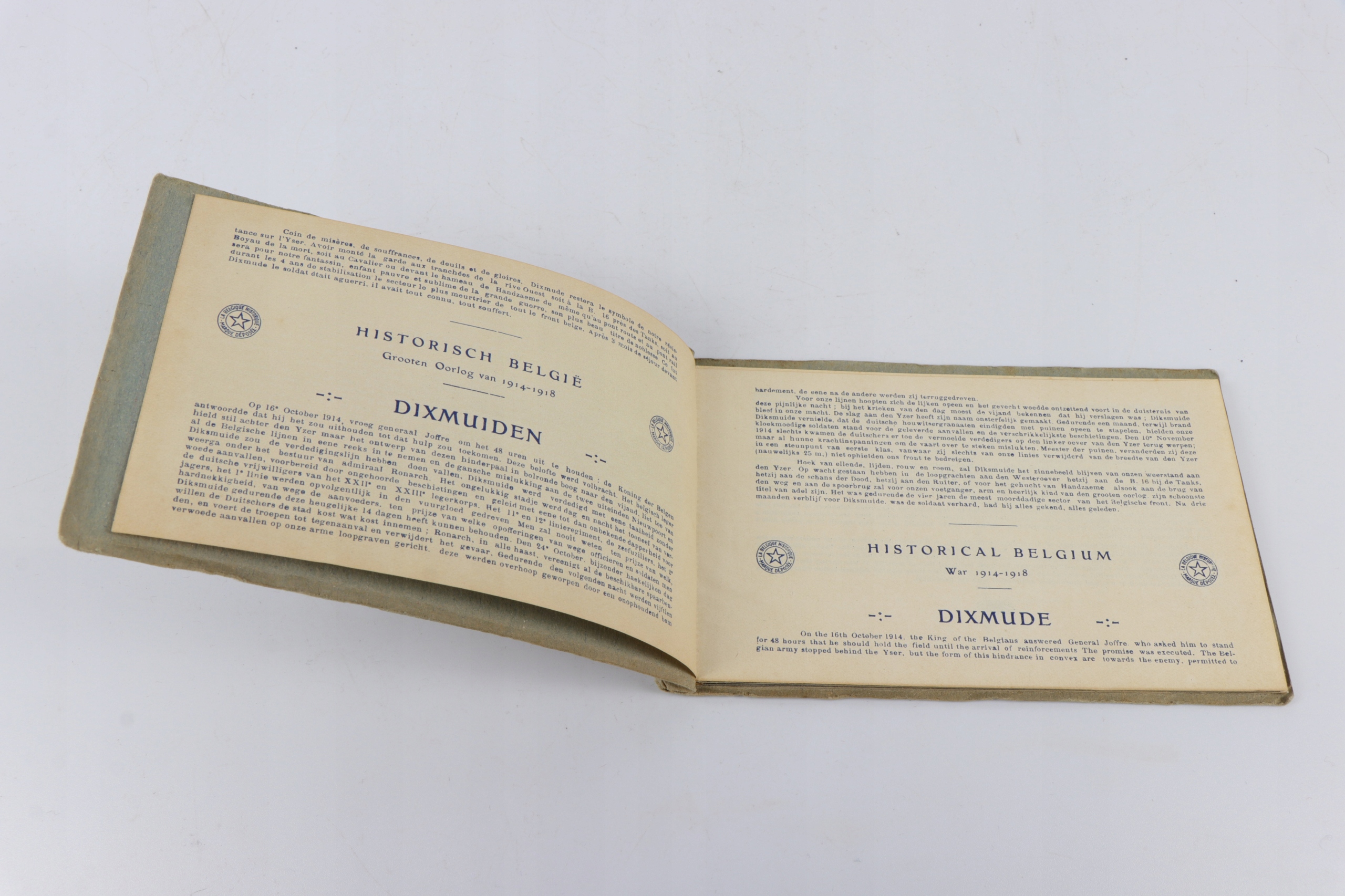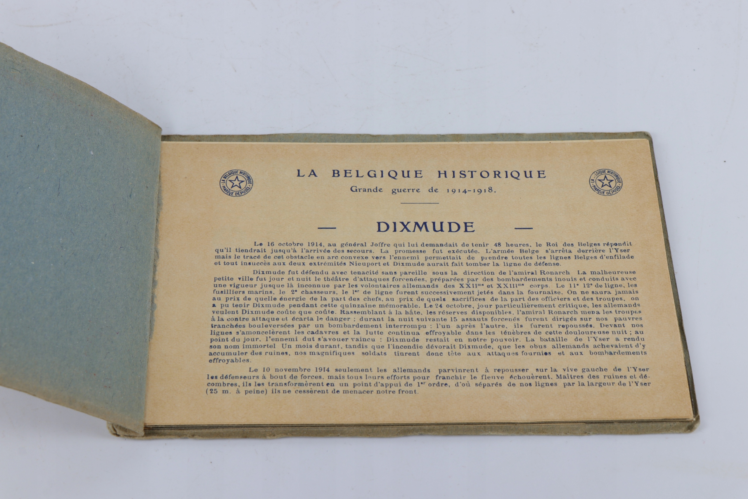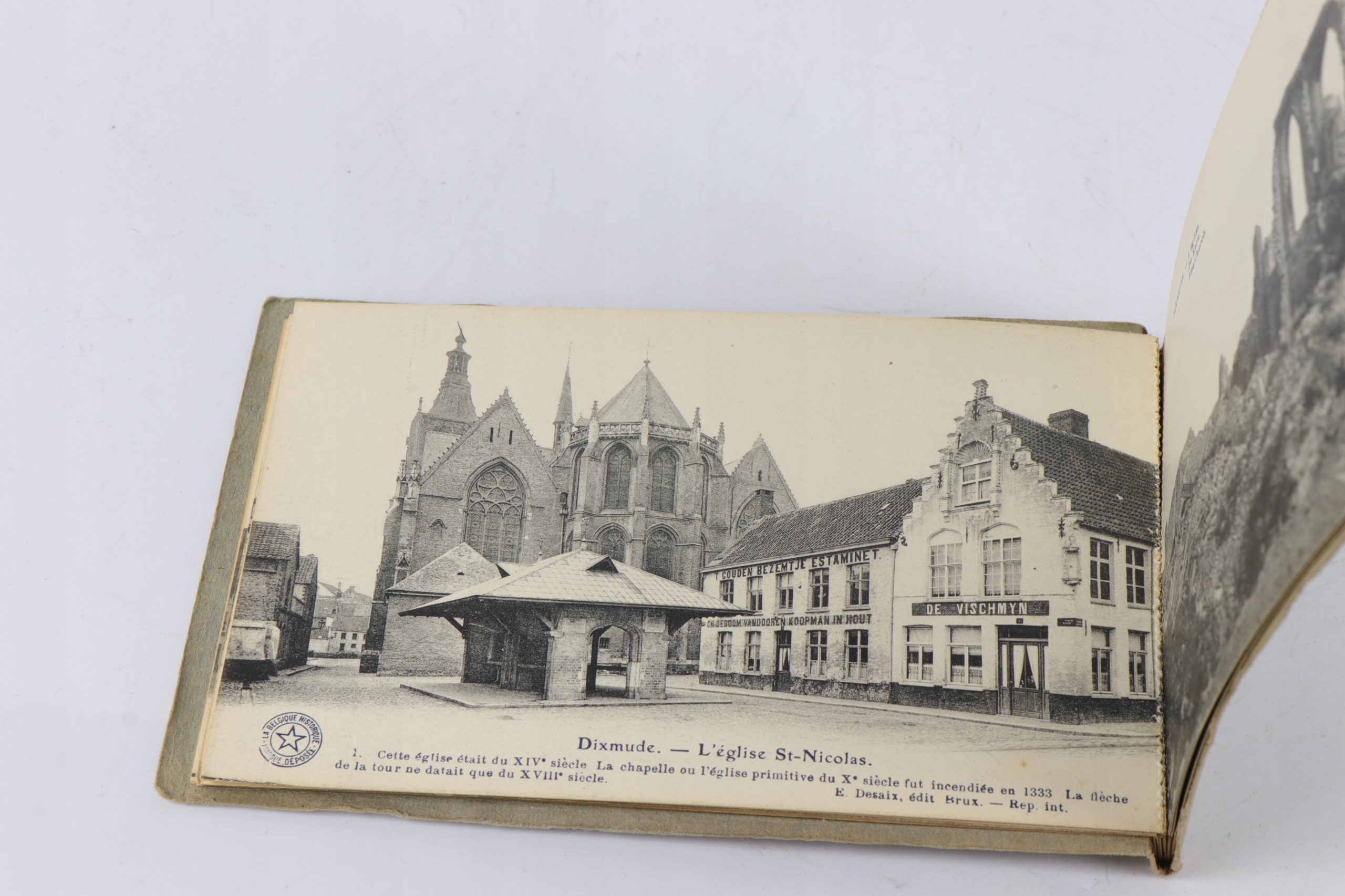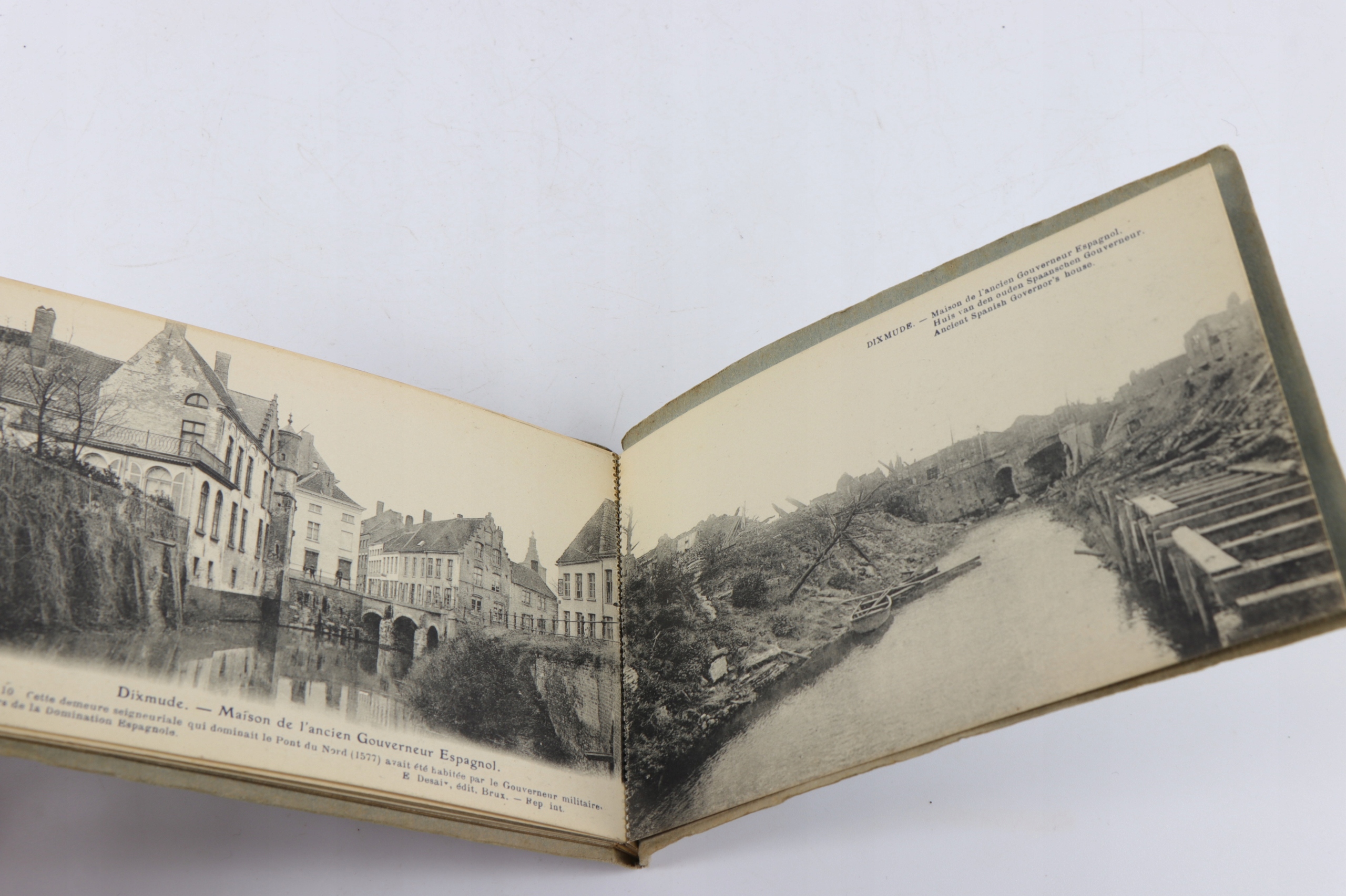 Интересная оригинальная книга с десятью открытками, показывающими разрушения в Диксмуде во время Первой мировой войны. На открытках показано сравнение объекта до Первой мировой войны с одной стороны и объекта, разрушенного после Первой мировой войны, с другой.