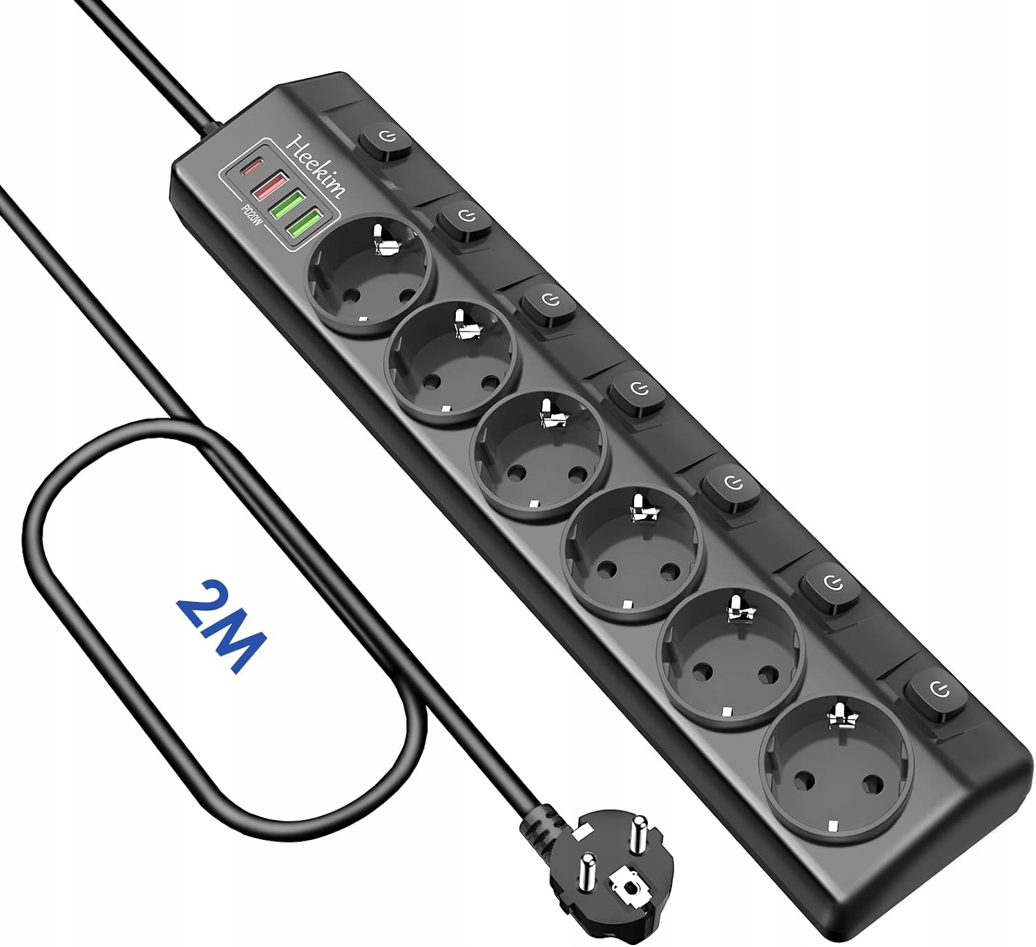 LISTWA ZASILAJĄCA PRZEDŁUŻACZ HEEKIM 6 GNIAZDOWY 3 PORTY USB 2M TRWAŁA PRO