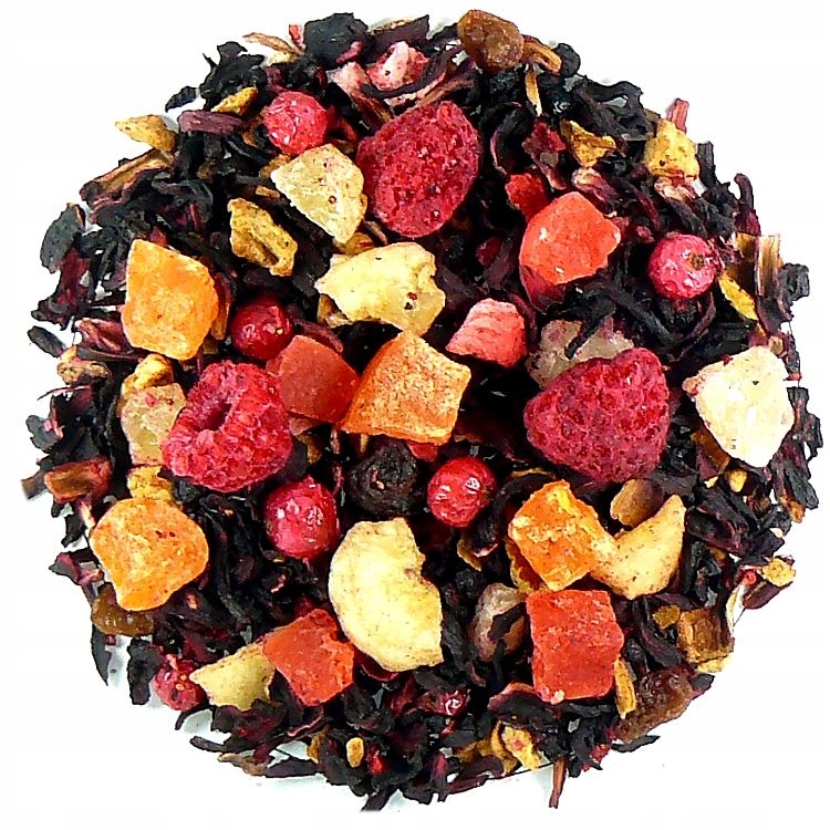Композиция: Гибискус, ананас, папайя, изюм, фрукты бузины, яблоко, банан, клубника, клубника, малина, Красная смородина, аромат