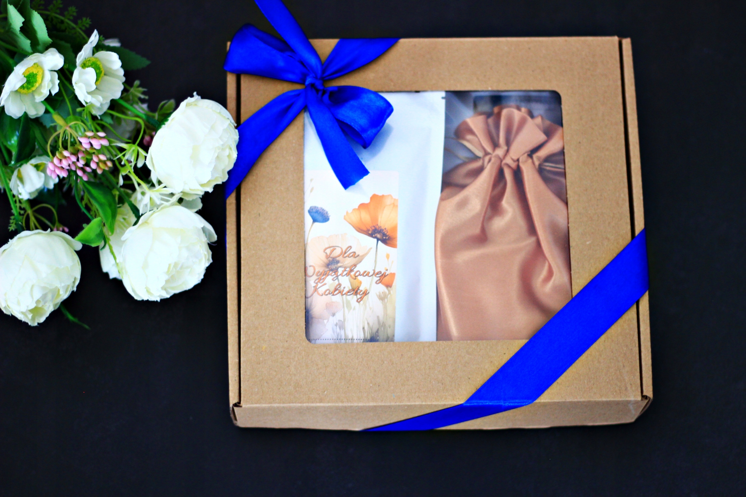 Кроме того, чаи обернуты в картон с окном, привязанным к декоративной ленте. коробка, наполненная деревянной шерстью.