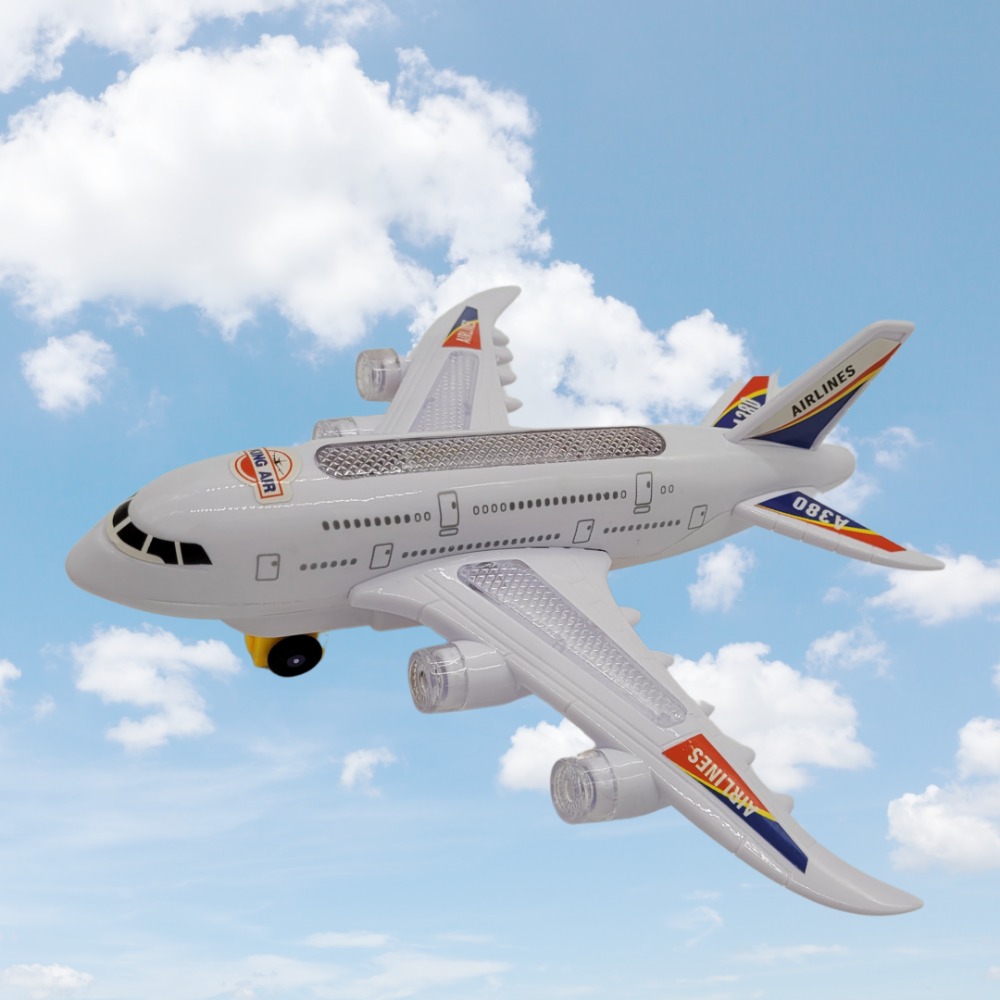 ИГРУШКА САМОЛЕТ, ПИТАНИЕ ОТ 3 БАТАРЕЙОК АА 1,5 В. Самолет издает звук летательного аппарата. Он также имеет зелено-сине-красные световые эффекты, огни на крыльях и фюзеляже. У самолета три колеса, в том числе одно, приводящее его в движение. После столкновения с препятствием игрушка пойдет по новому пути.