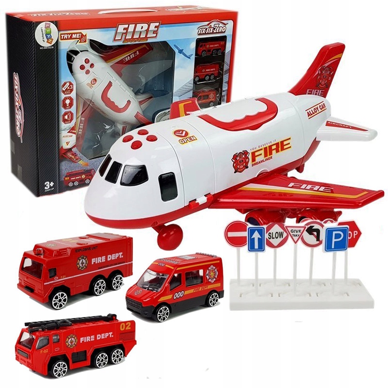 Фантастический набор самолет-транспортер Пожарная служба для перевозки автомобилей. Это отличная игрушка для пожарных и любителей авиации. Благодаря ручке, установленной на самолете, его можно взять с собой куда угодно, и в небе будет бесконечное веселье.