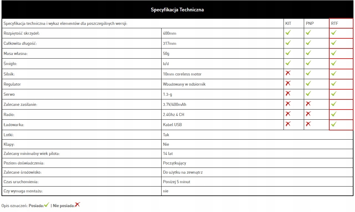 Самолет в версии RTF, модель включает в себя все необходимые для полета элементы такие как двигатель, регулятор , сервоприводы, аккумулятор, зарядное устройство, передатчик и приемник. Для самостоятельного питания передатчика вам потребуется приобрести 4 палочки АА.