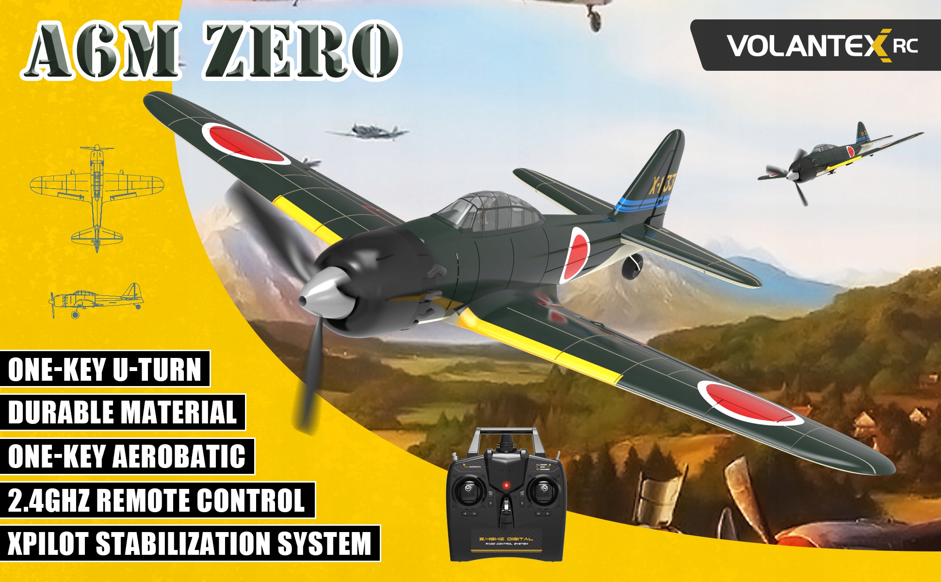 A6M Zero был грозным противником в борьбе за господство на островах Тихого океана. Теперь вы можете воплотить эти бои в жизнь с помощью этого нового мини-боевого самолета, который благодаря встроенной системе гироскопической стабилизации Xpilot готов развлечь пилотов всех навыков. Благодаря мощному редуктору и бессердечному двигателю самолет устойчив, маневрен и даже может выполнять акробатические трюки благодаря функции акробатики одной кнопкой. Просто нажмите одну кнопку и потяните ручку, чтобы легко управлять A6M Zero и выполнять акробатические трюки.