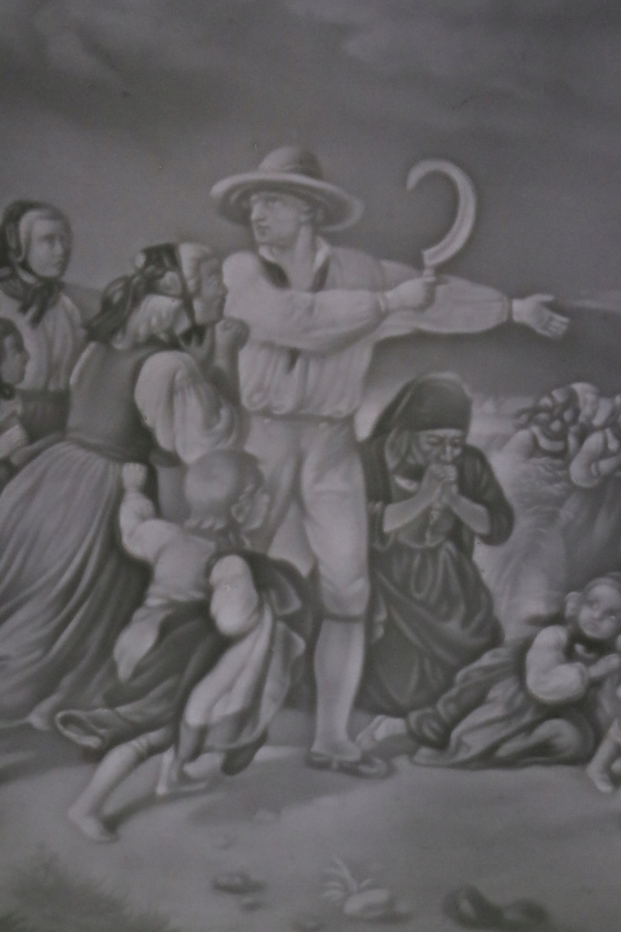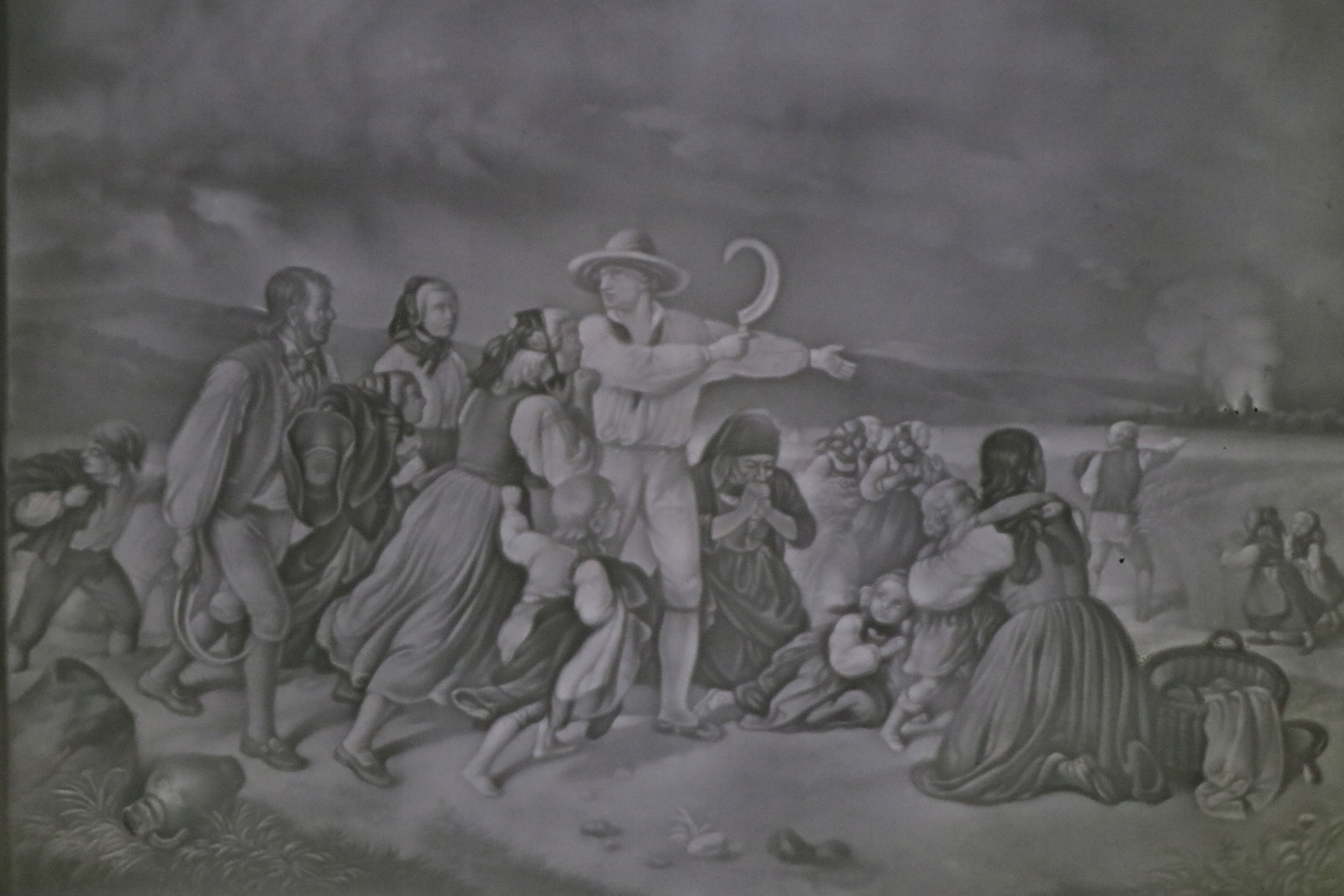 Фарфоровая пластинка с изображением литофана. Мотив основан на картине Якоба Беккера фон Вормса L'orage 1839-1842 годов, находящейся во дворце Шляйсхайм в Баварии. Таблички используются в старых абажурах XIX века или вставляются в специальные подставки. Фарфор с характерным изображением, создаваемым при освещении.