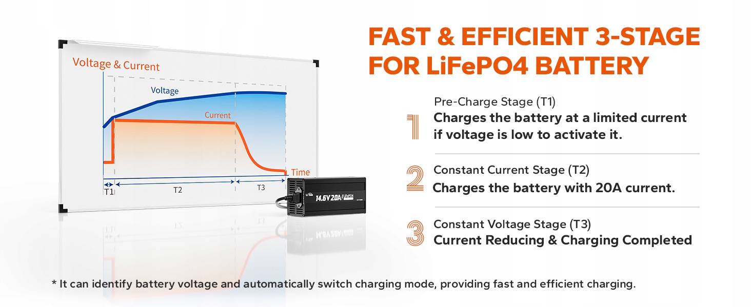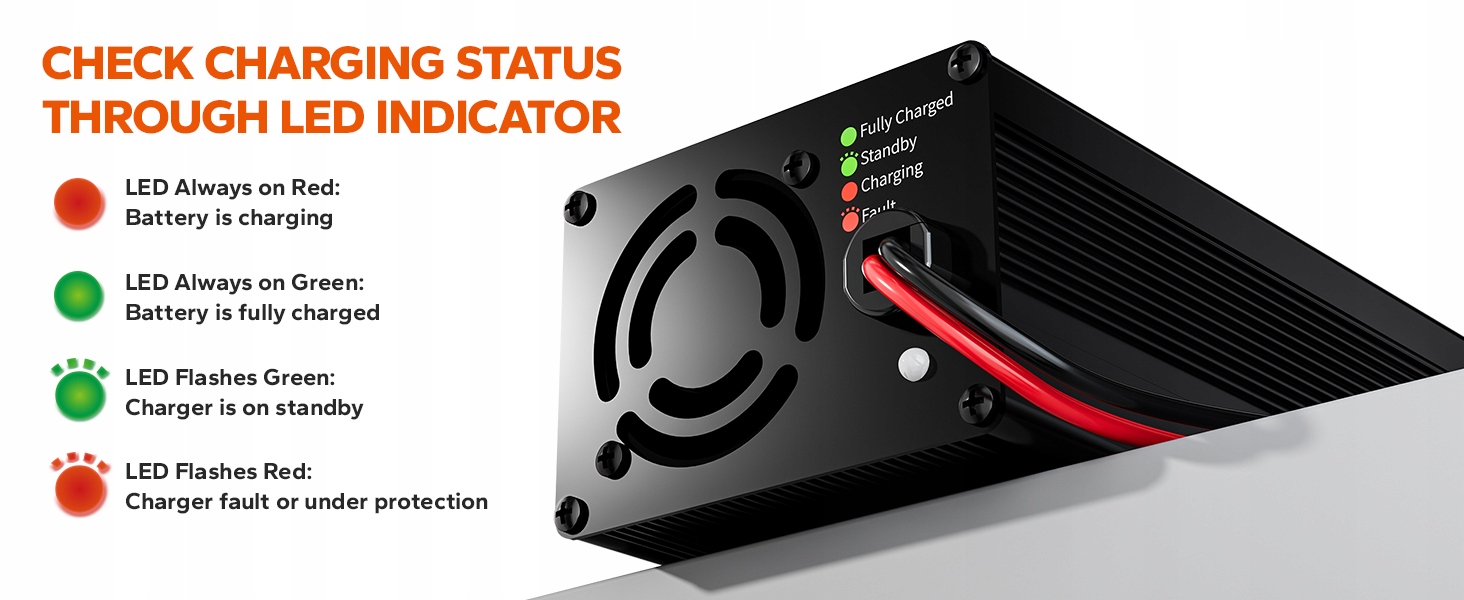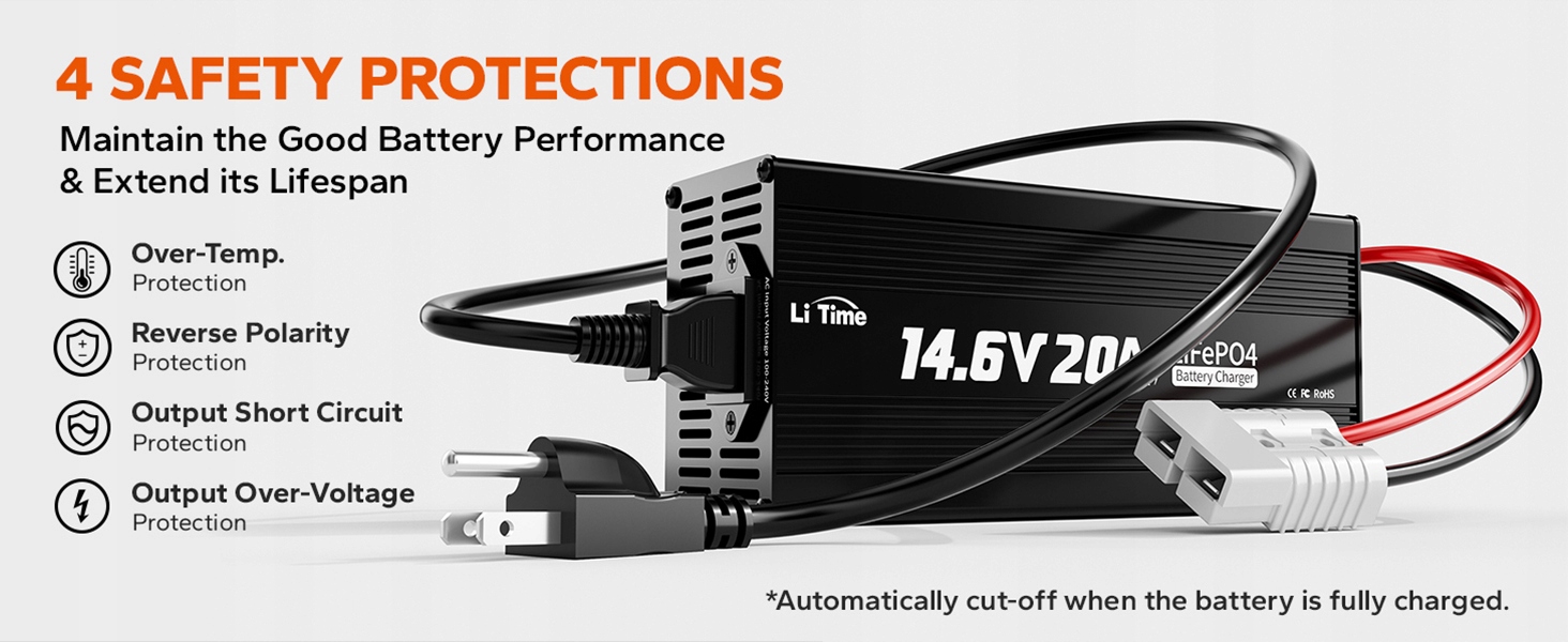Зарядное устройство LiTime 12V LiFePO4 может защитить и контролировать вашу батарею в любое время. Он обеспечивает 100% надежную защиту от перегрева, обратной полярности, короткого замыкания на выходе, перегрузки по выходному току и перенапряжения на выходе, а также отображает состояние зарядки аккумулятора в режиме реального времени в соответствии с мигающими светодиодными индикаторами.