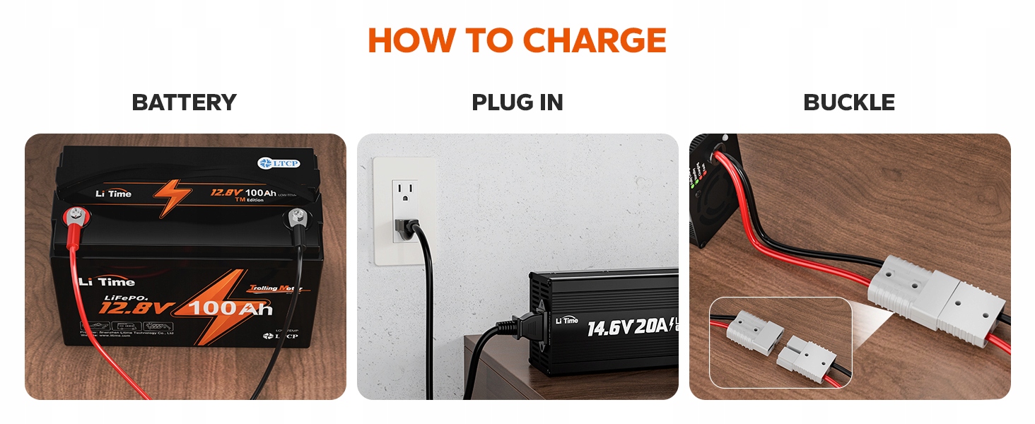Зарядное устройство LiTime — это удобное и безопасное устройство. Сначала подсоедините выходной кабель постоянного тока к аккумулятору, убедившись, что положительные и отрицательные соединения выполнены правильно. Затем подключите разъем Anderson, прежде чем подключать вход переменного тока к розетке.