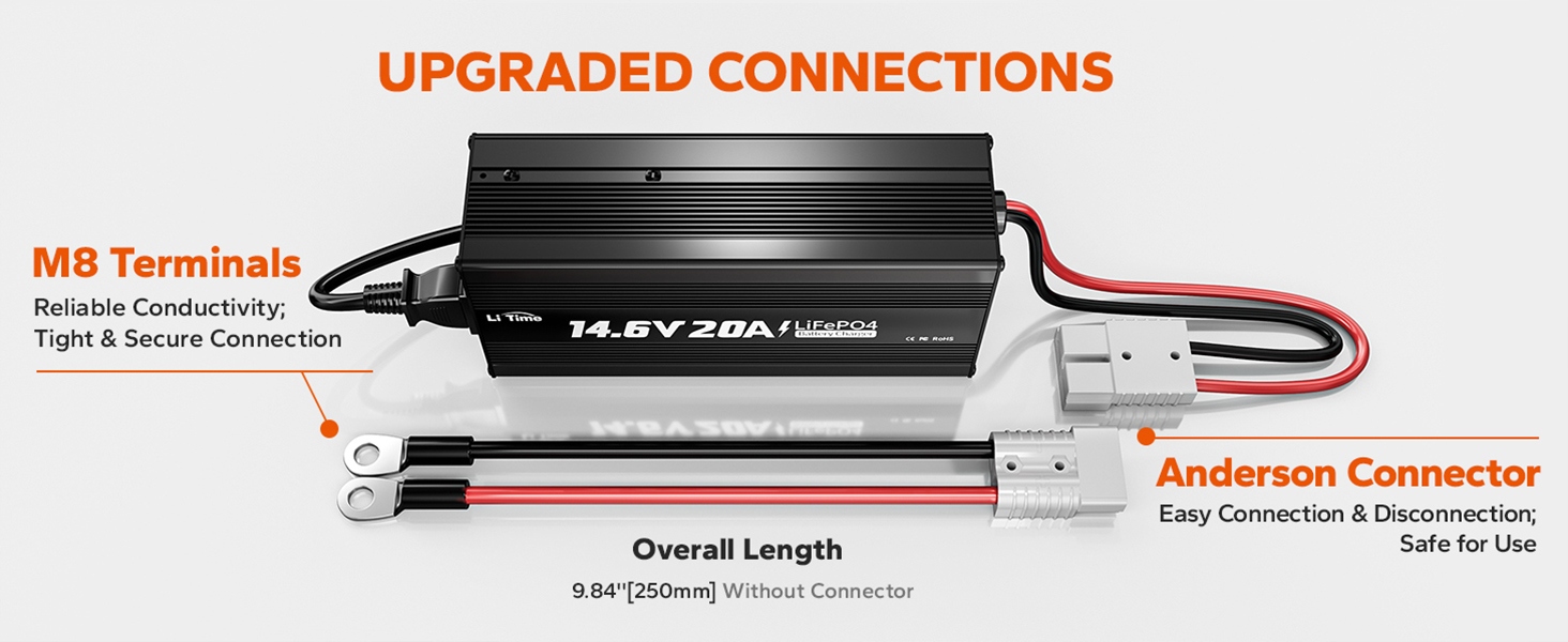 Зарядное устройство для литиевой батареи LiTime 12 В модернизируется до разъема Anderson на 50 А и клемм M8 для упрощения подключения. Подключите зарядное устройство в соответствии с инструкциями, и вы сможете наслаждаться надежностью Plug & Play.