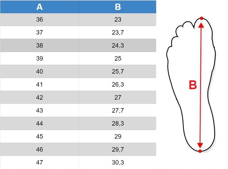 B - длина стельки (см) - Измерьте от начала до конца стельки той обуви, в которой вы чувствуете себя наиболее комфортно.