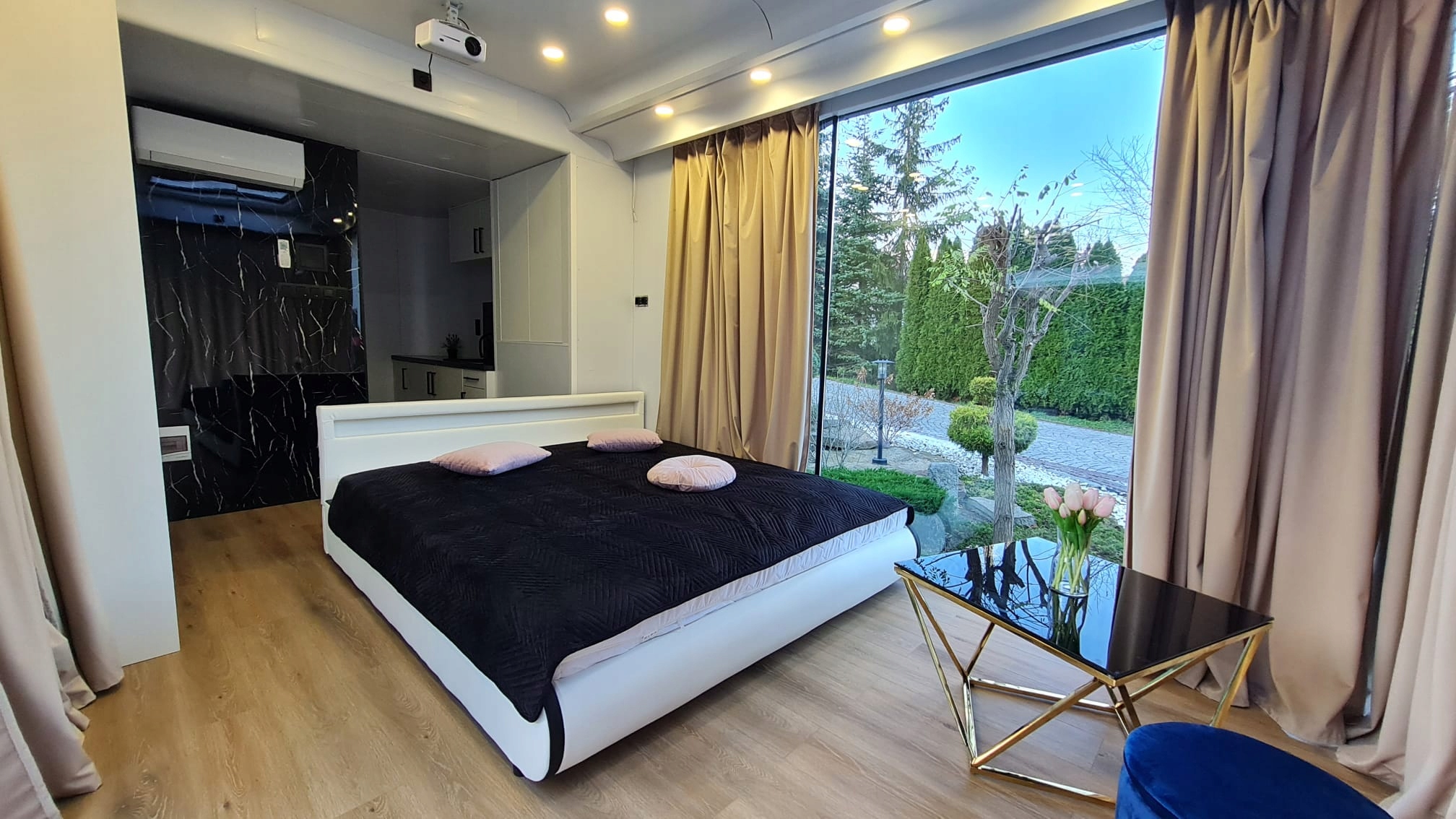 Самая большая комната — спальня, соединенная с мини-кухней, откуда через раздвижные стеклянные двери можно пройти в ванную комнату или на террасу. Спальня оборудована большой двуспальной кроватью, проектором и проектором, благодаря чему скучать холодными вечерами не придется. Стены в гостиной стеклянные, поэтому вы можете расслабиться и полюбоваться красотой природы снаружи, а когда вам захочется немного уединения, вы можете закрыть окна плотными шторами. Ванная комната оборудована современной душевой кабиной с тропическим душем, умывальником с водонагревателем и туалетом. Интерьер выглядит чрезвычайно эффектно и современно. Терраса полностью крытая, имеет впечатляющую стеклянную перегородку и освещение.