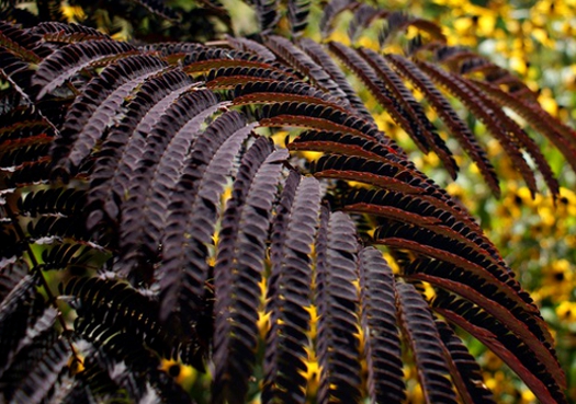 Он ценится во всем мире за свои неоспоримые декоративные качества. Листья напоминают воздушные веера – чем-то похожи на мимозу, крупные, шоколадного цвета в течение всего сезона.