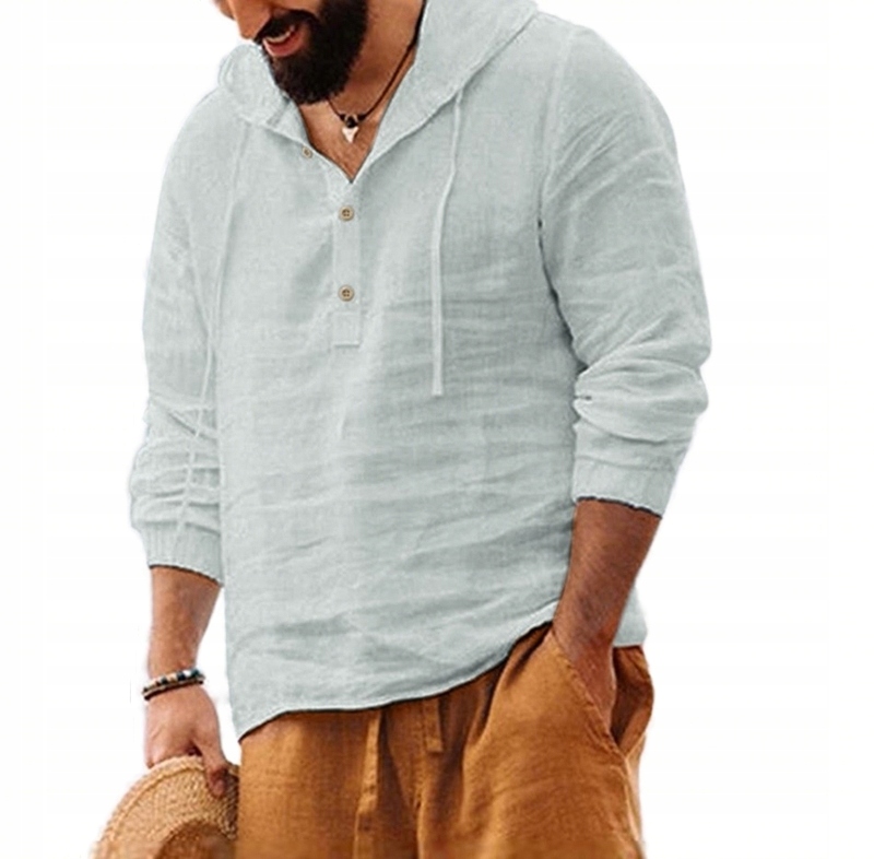 Летний мужчина свободный хлопок и льняная рубашка с капюшоном