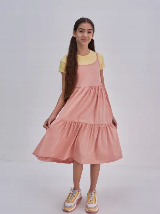 Для активных девушек лучшим нарядом станет удобное платье из мягкой хлопчатобумажной ткани. Его чрезвычайно девичий крой понравится каждому модному подростку. Он красивого персикового цвета идеально сочетается с яркими кроссовками или сандалиями. Джинсовая куртка станет отличным дополнением наряда. Платье имеет завязки на плечах, что позволит подогнать его по фигуре. Декоративные рюши придают ему неповторимый шарм. Классический круглый вырез горловины дополнен складкой из того же материала.