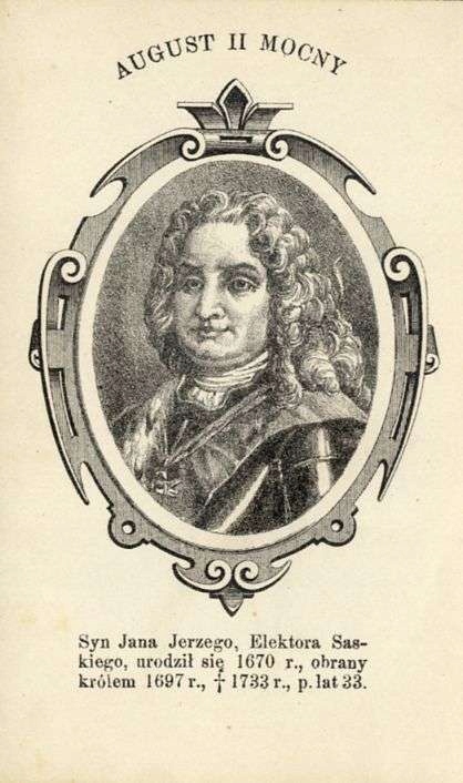 - Август II Сильный (нем. August II der Starke, также August II Sas) (05.12.1670 Дрезден - 02.01.1733 Варшава) с 1694 г. Курфюрст Саксонии как Фридрих Август I ( Фридрих Август I.), викарий Священной Римской империи, в 1697-1706 и 1709-1733 годах избирался королем Польши. 27 июня 1697 года он был провозглашен польским королём. Пытаясь захватить Ливонию, он сформировал антишведский союз. После захвата Саксонии шведскими войсками он отрекся от престола 24 сентября 1706 года. После поражения шведов под Полтавой в 1709 году он вернулся на польский престол. Он безуспешно пытался реформировать государство в абсолютистском духе; видеть SBHP т. 1 стр. 30