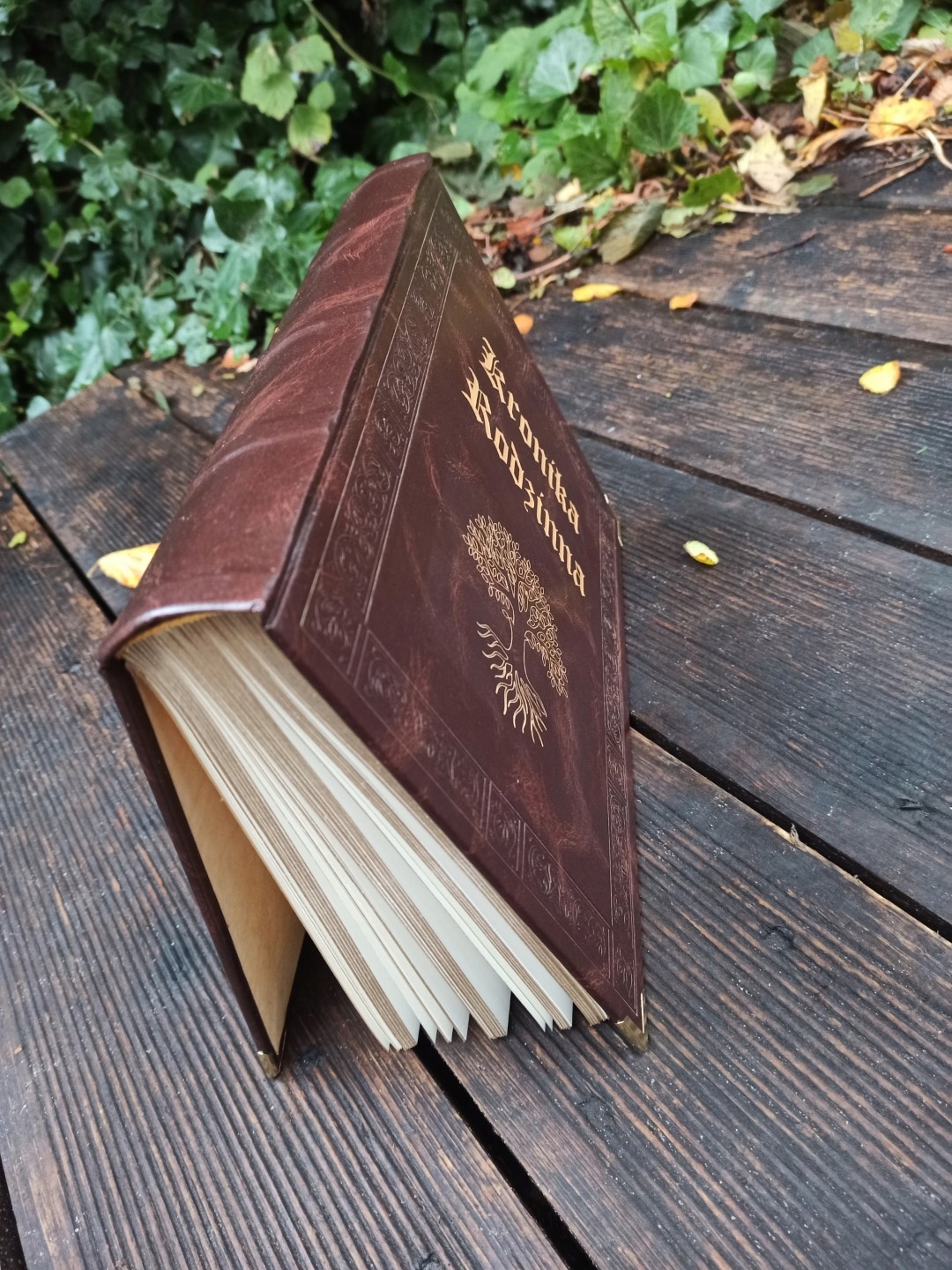 Книга прошита нитками со специально утолщенным корешком, что позволяет наклеивать фотографии или большие объемы. материалов без эффекта разбухания и изгиба
