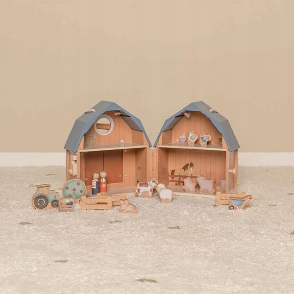 В комплект входят фигурки, связанные с фермерской жизнью, и 2 деревянные куклы. А когда веселье закончится, просто спрячьте все фигурки внутрь домика.