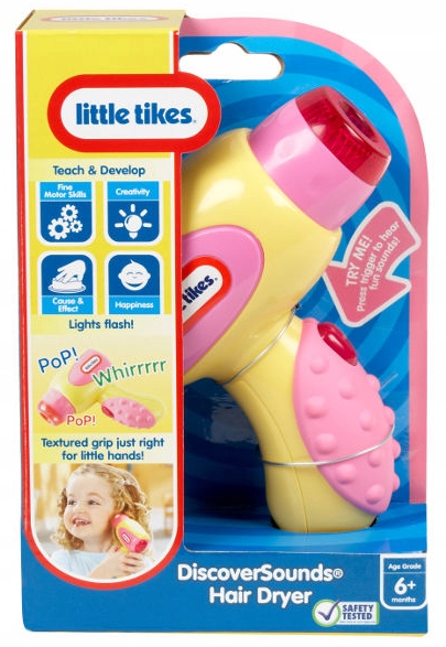 Каждый раз, когда вы нажимаете кнопку на ручке фена, игрушка издает забавные звуки и загорается розовая лампочка.
