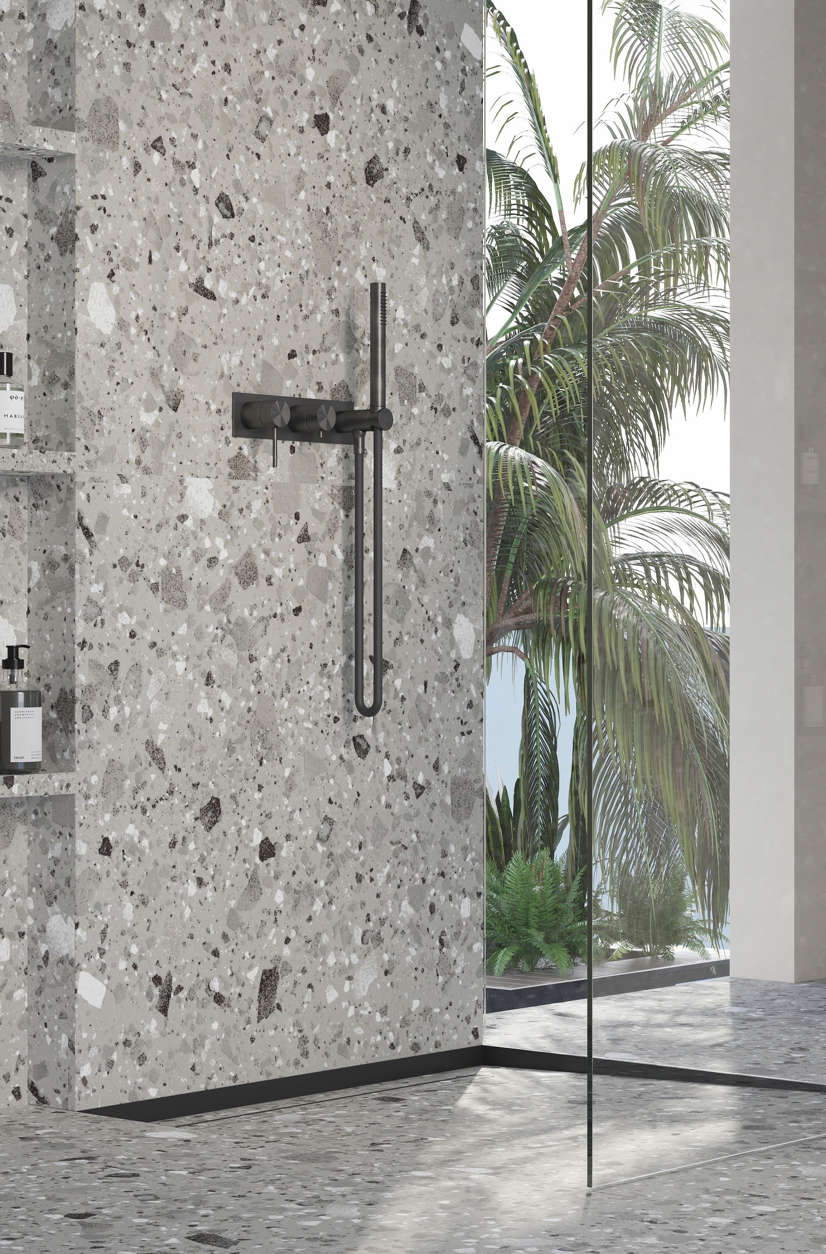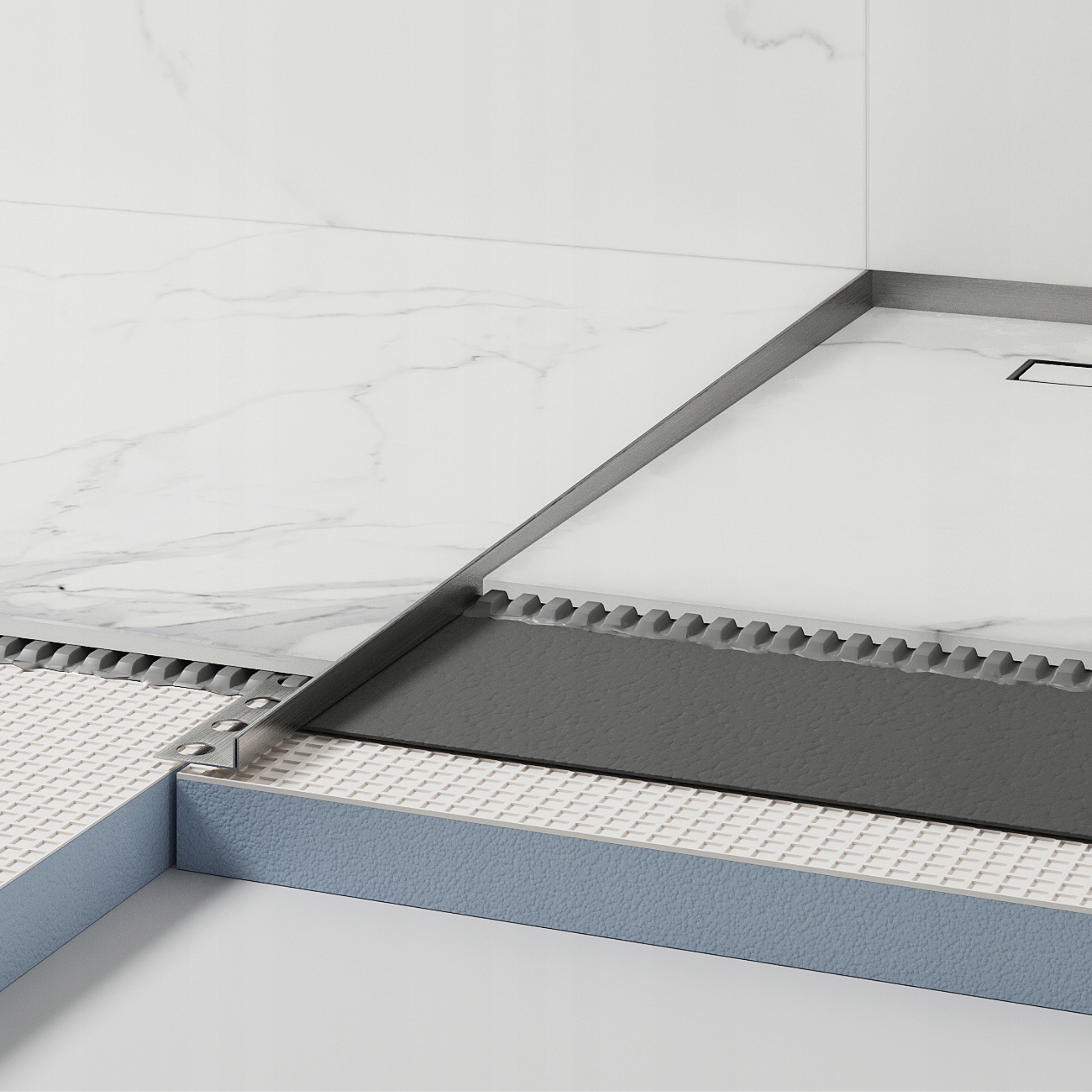 Наклонная полоса предназначена для маскировки потенциально некрасивые концы плитки, при этом допускается естественный наклон к сливу без необходимости точной резки плитки. Благодаря этому решению душевой поддон соответствует самым высоким стандартам как технически, гарантируя правильный отвод воды, так и визуально, придавая ванной комнате элегантный характер .