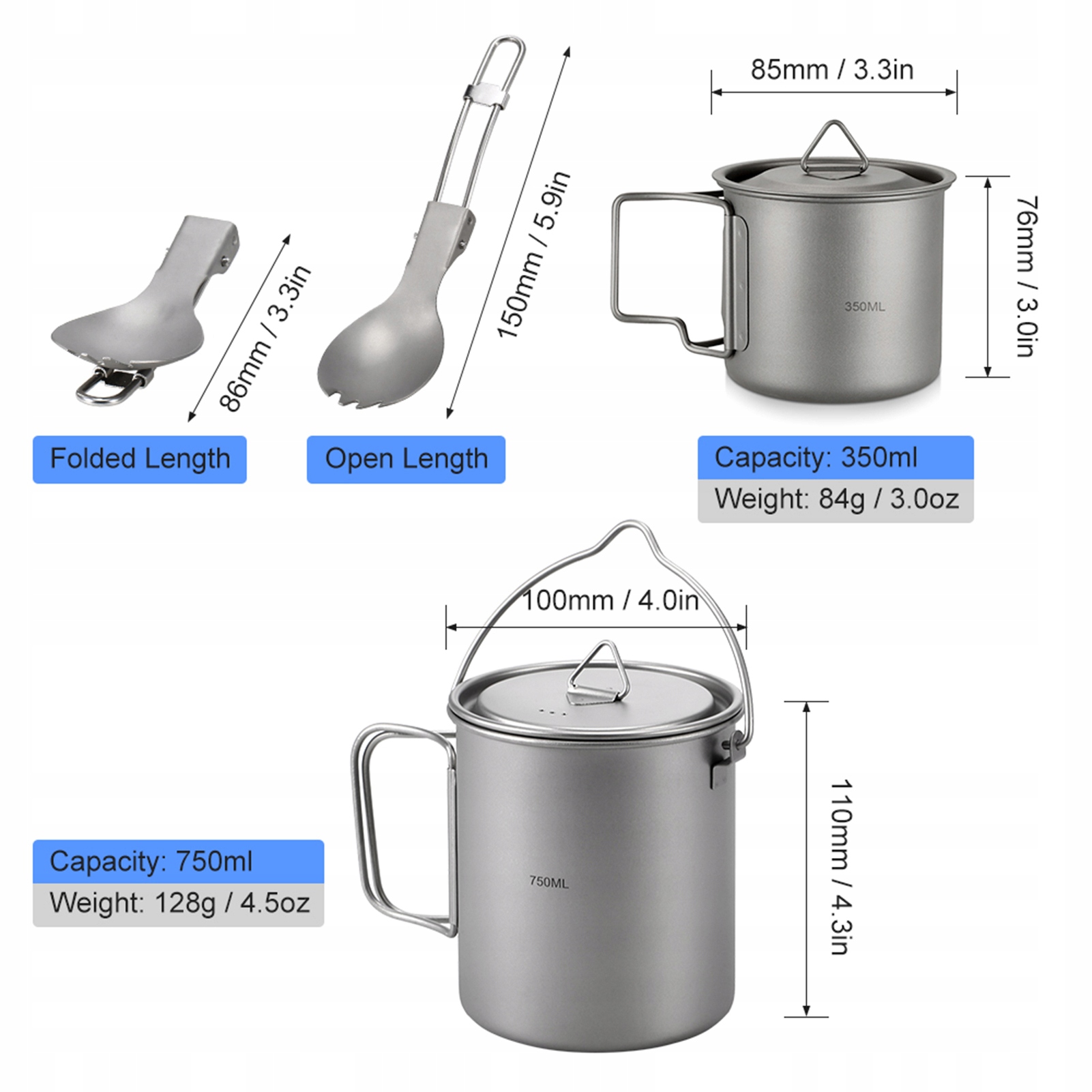 1. Набор из 3 штук: полный набор титана содержит 750 мл горшков, чашку 350 мл и складывающуюся споры, идеально подходящую для кемпинга, походов, рюкзаков, приключений на свежем воздухе и выживания.