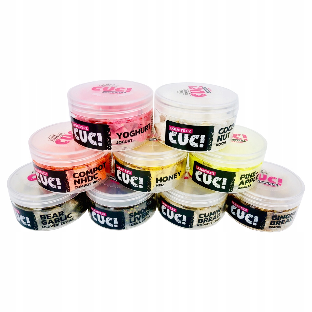 Из чего состоит CUC!? ? КУЦ! Он состоит в основном из легкоусвояемого белка, включая специальную смесь незаменимых аминокислот, которые вызывают у рыб сигнал о кормлении и повышают аппетит. Этот сигнал активируется сразу после контакта с водой, когда объем приманки увеличивается и вымываются другие привлекательные природные вещества. В зависимости от вкуса CUC! содержат планктон, высококачественную рыбную муку, бентос, фруктовые смеси, морепродукты, насекомых, эфирные масла, подсластители, ферменты, травы, специи и красители.