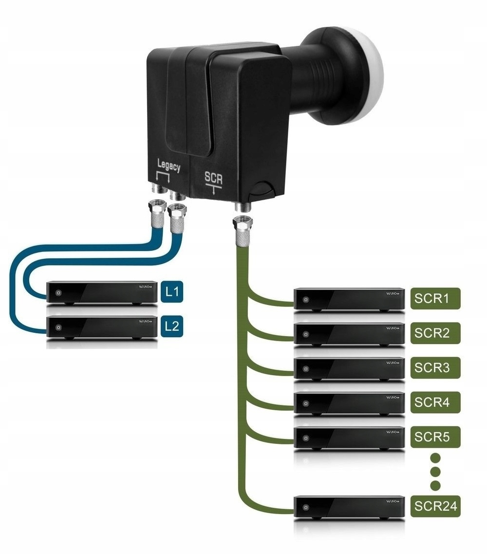 Коннасионный LNB однозначный SCR GT-SAT GT-S2DCSS24 для однопроводной (последовательной) спутниковой передачи сигнала до максимума. 24 приемника с маркировкой однозначной II.