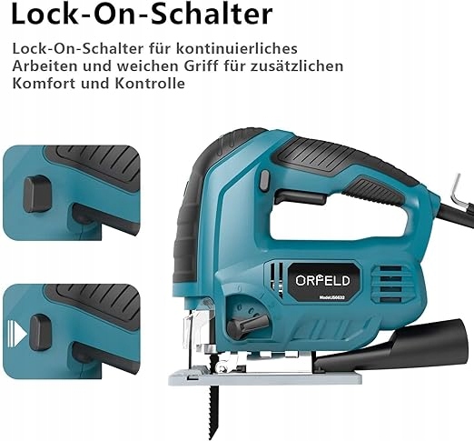 - Высокая производительность: оснащенный мощным двигателем мощностью 850 Вт и 6 различными пильными полотнами, лобзик Orfeld легко распилит любой материал, в том числе дерево. а также алюминий. Даже при использовании твердого сплава максимальная глубина резания может достигать 10 мм.