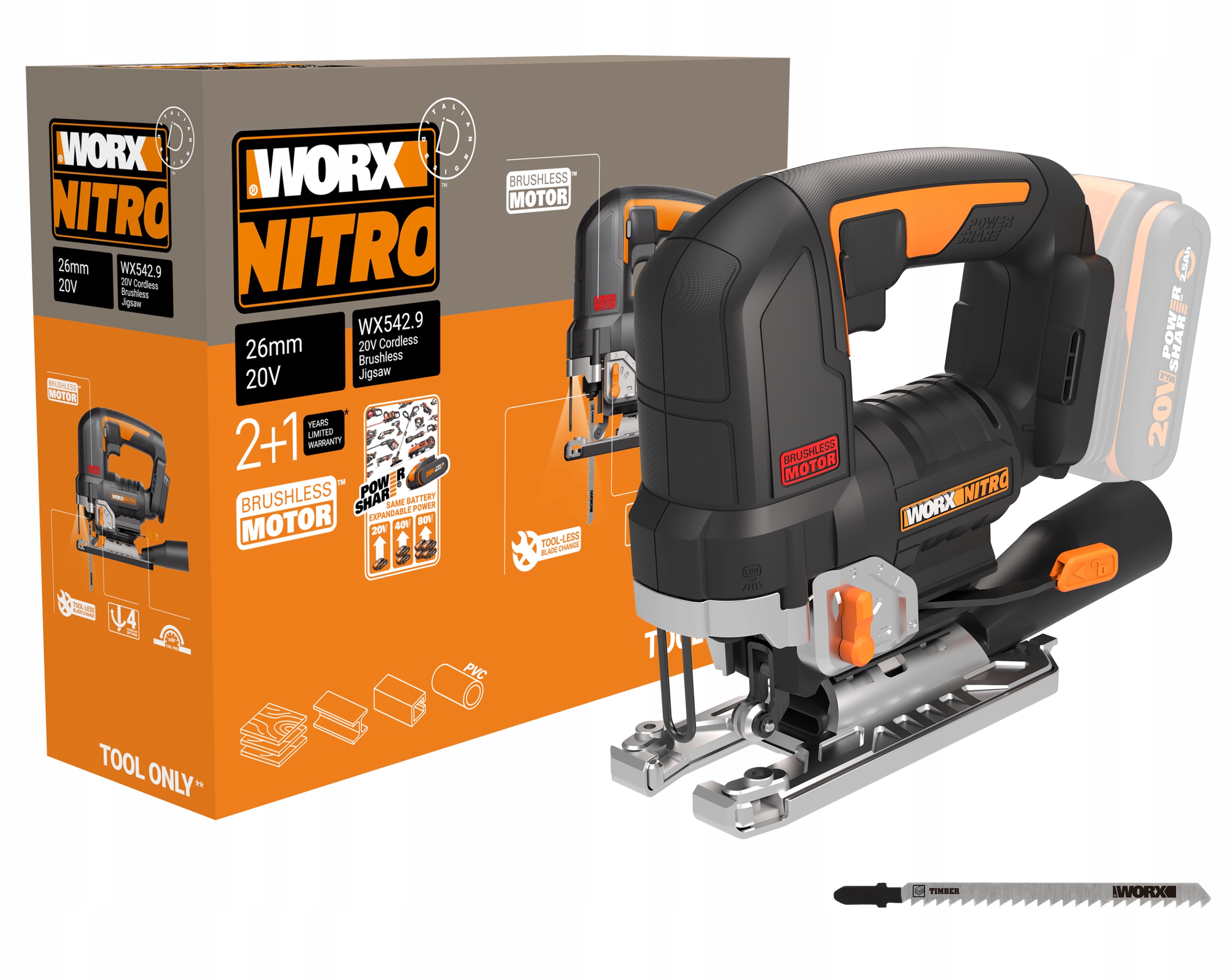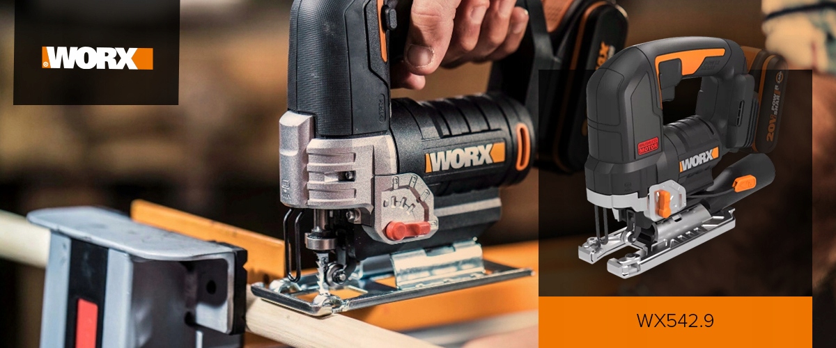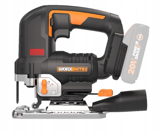 Аккумуляторный лобзик марки WORX из серии PowerShare, оснащенный бесщеточным двигателем с Ход поршня 26 мм.
