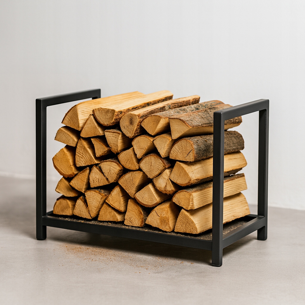 Подставка для дров, сваренная вручную вмещает ежедневный запас дров, не перегружая пространство.
