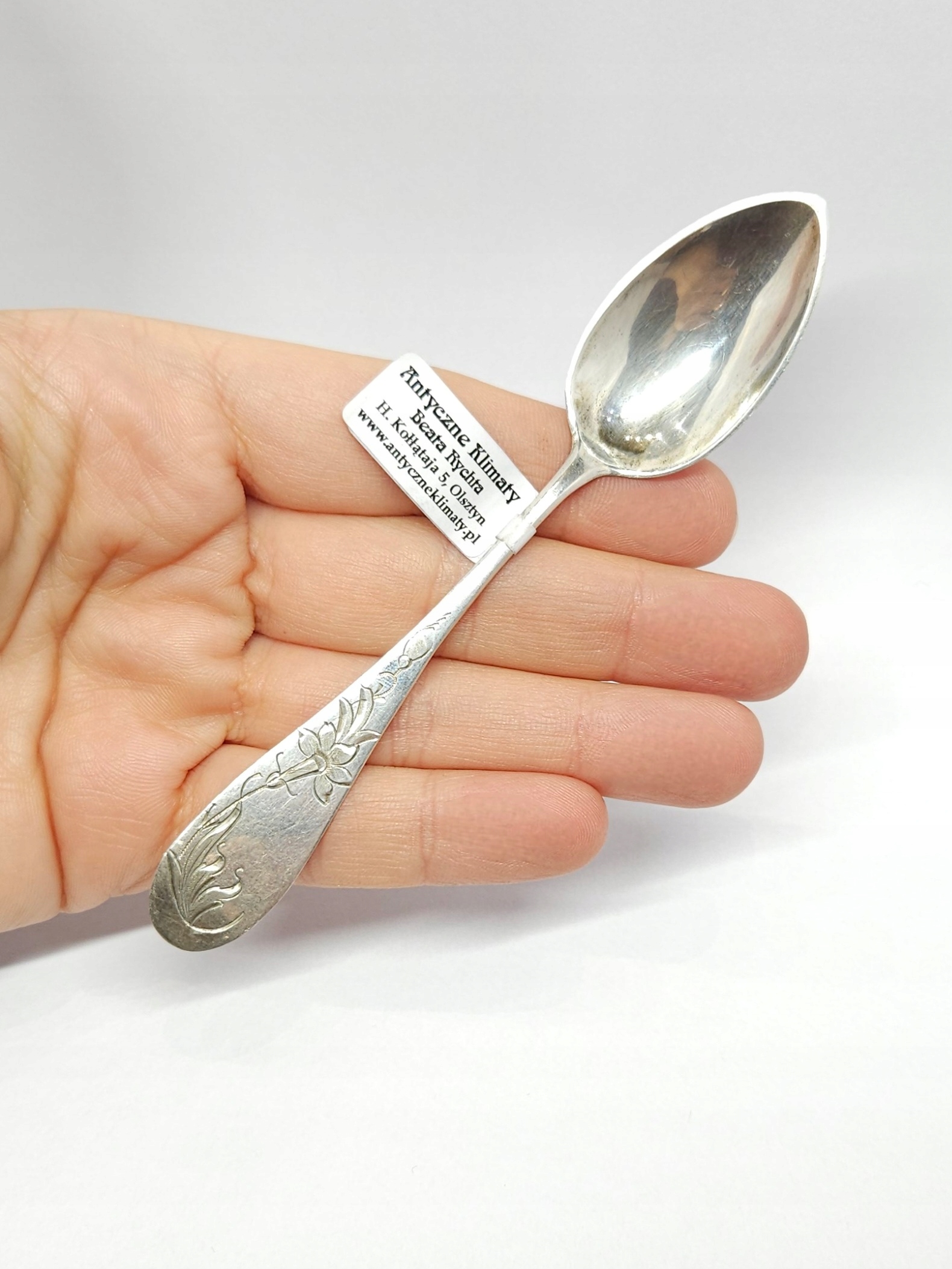 Серебряная ложка начала XIX века XX века, с ручкой, украшенной гравировкой цветочного мотива в стиле модерн; В связи с возрастом возможны небольшие микроцарапины.