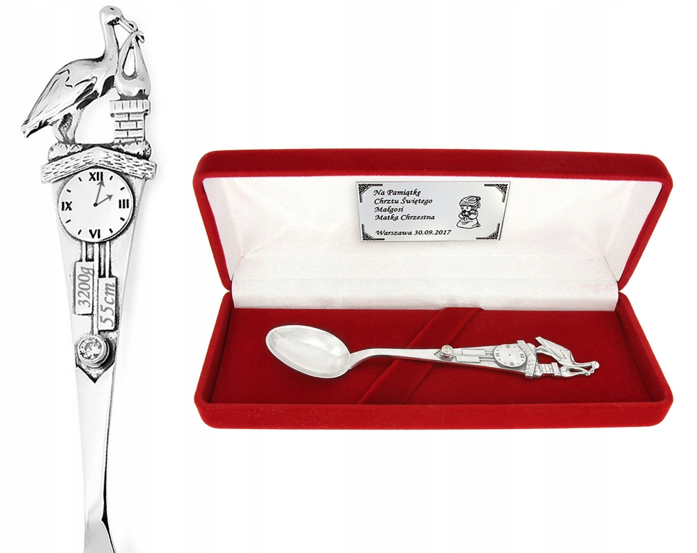 Ложка с аистом – прекрасный подарок на Крещение или сувенир на день рождения как мальчику, так и девочке. Изготовлен полностью из серебра 925 пробы (проверено Пробирной палатой в Варшаве). В ложку встроен один фианит SWAROVSKI ELEMENTS. Индивидуальное посвящение и гравировка сделают подарок уникальным и неповторимым. Мы бесплатно гравируем данные на ложке и посвящение на коробке.