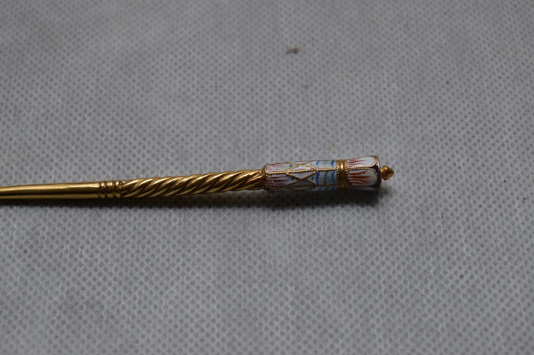 Серебро с толстым позолотой, украшенное разноцветной ячеистой эмалью вокруг.
