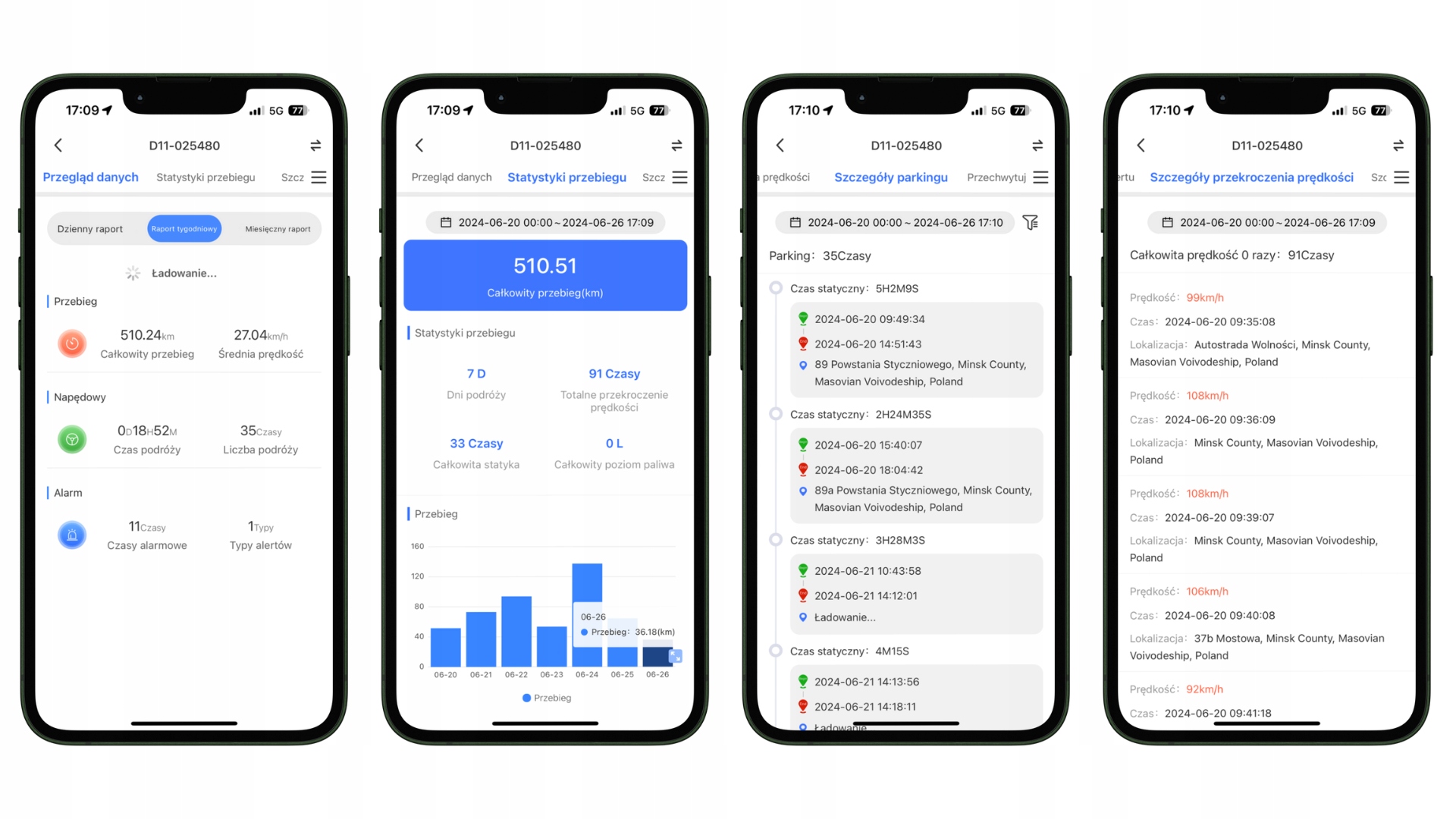 Приложение показывает общий пробег, количество дней в пути и количество нарушений скорости. С помощью этих данных вы можете анализировать свой стиль вождения, оценивать эффективность поездок и принимать решения по повышению безопасности и эффективности. Это идеальное решение для частных водителей и менеджеров автопарков, которые хотят максимально эффективно использовать свои автомобили.