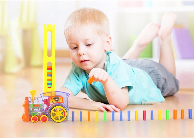 В комплект входит электропоезд, магазин блоков, 60 штук блоков домино